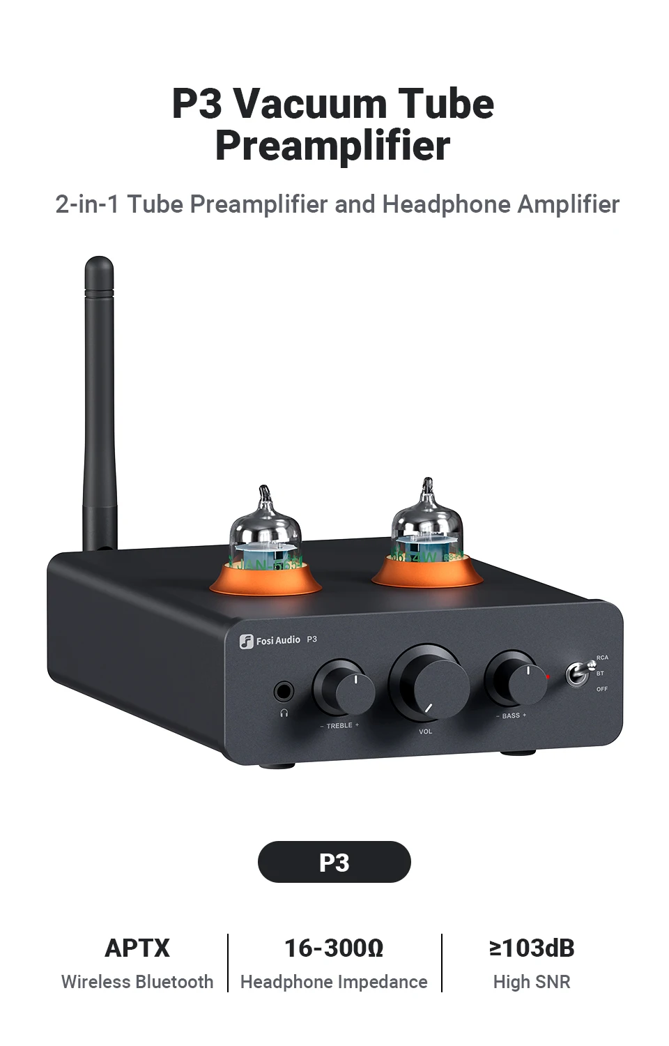 Fosi Audio P3 Bluetooth Tube Amplifier HiFi Stereo Preamplifier Valve Vacuum with Treble & Bass Tone Control For Home Speaker