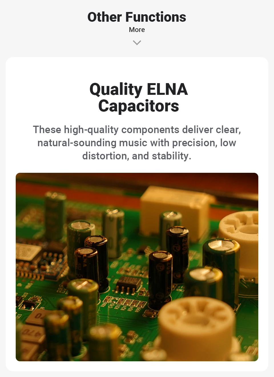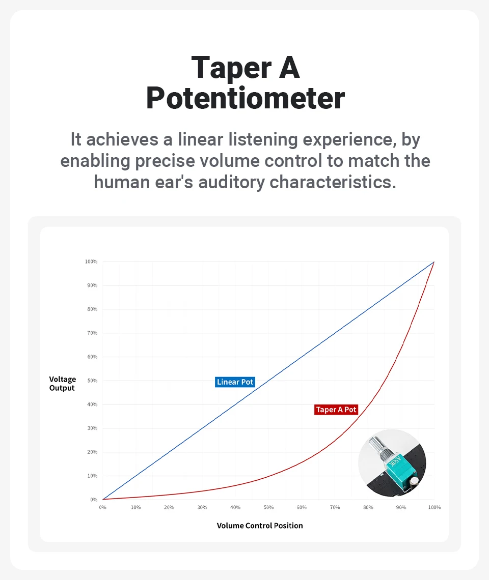 Premium Components: It utilizes ELNA audiophile-grade capacitors and taper A pot. The bass and treble controls boast central detents for tone-defeating. With an SNR of up to 103dB and a crosstalk of 95dB, it helps form a HiFi audio system when paired with the V3 amplifier of the same series.