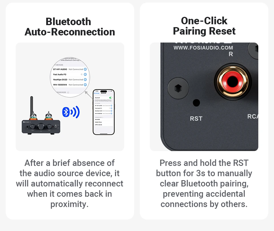 Bluetooth 5.1: Equipped with the Qualcomm QCC3031 chip, the P3 preamp guarantees impressive wireless sound quality and low latency, with compatibility for aptX HD and aptX LL codecs formats. Furthermore, the inclusion of a manual reset button prevents accidental connections by others, enhancing connection reliability.