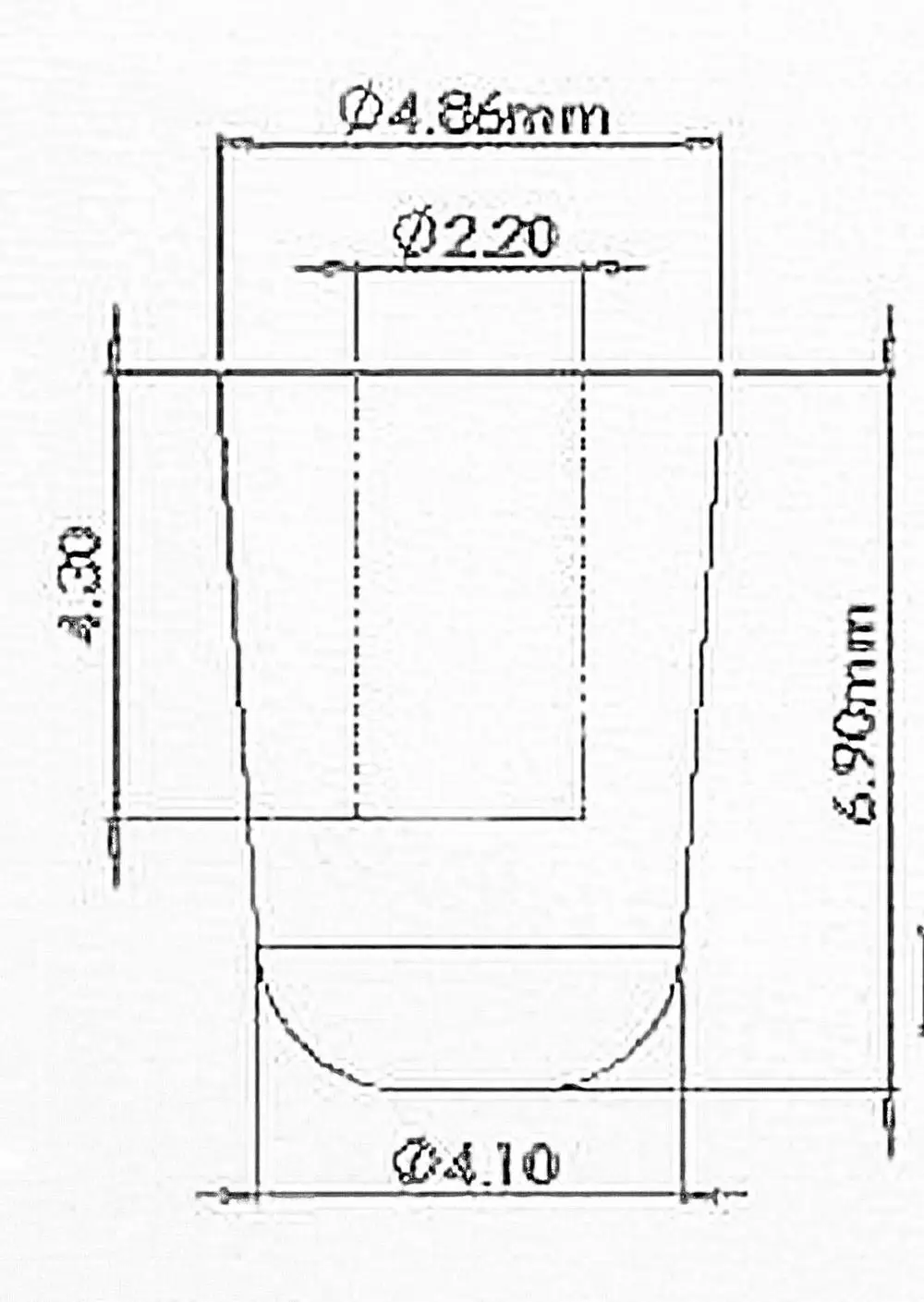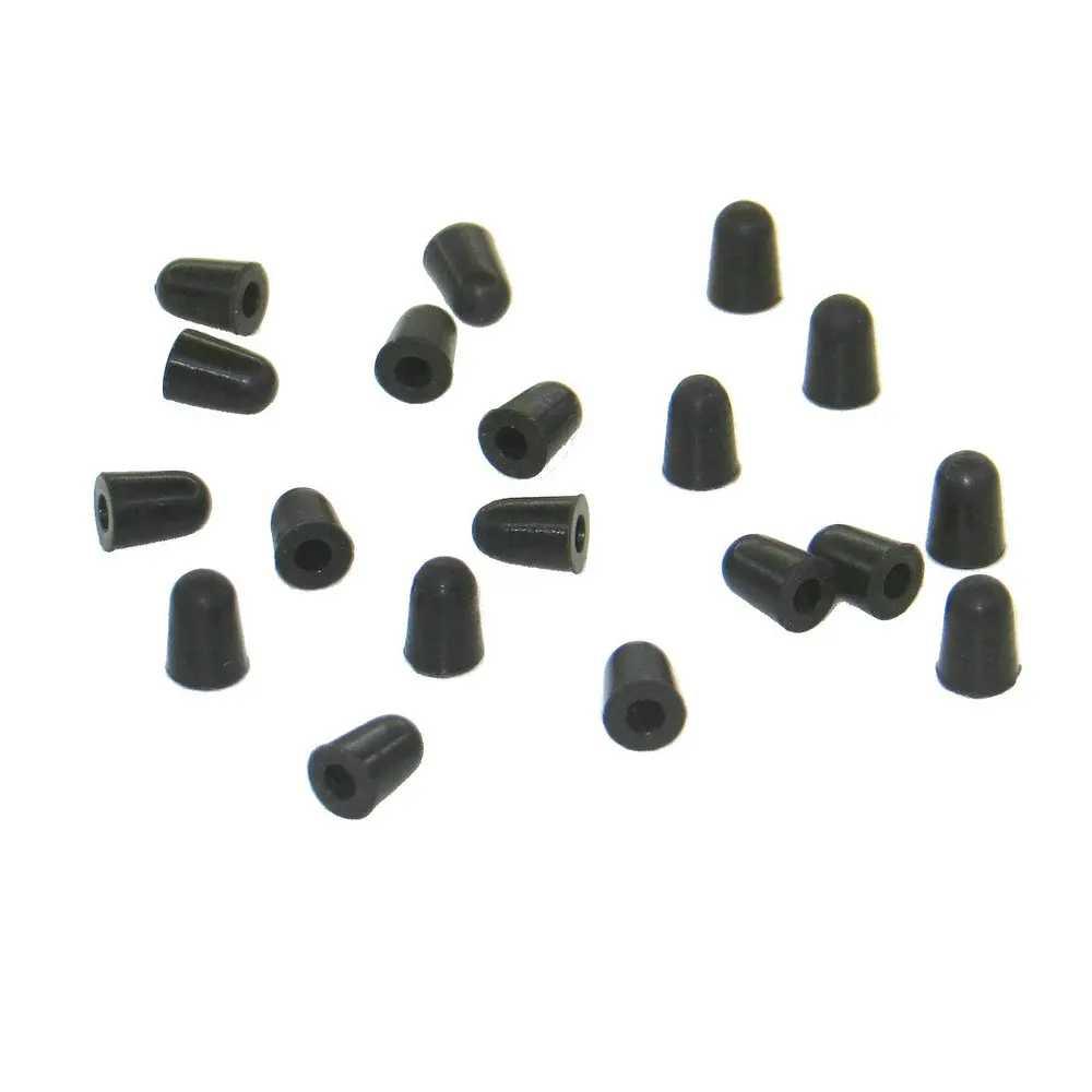 Best I can measure is: 5 mm diameter (about 3/16"), 7 mm tall (about 1/4"). with a smoothly rounded top. The hole in the bottom is bigger than a 5/64" drill and snug on a 3/32"drill. It appears to be a 4 mm deep. It is a relatively soft & squeezable rubber part. Softer than a pencil eraser.