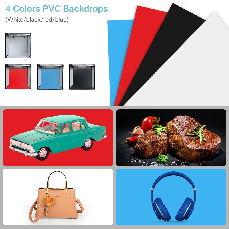 PVC shooting background included for long-term use. Wrinkle-free, shadow-free, waterproof. Suitable for different product shooting.