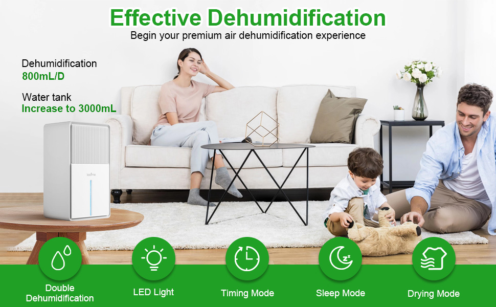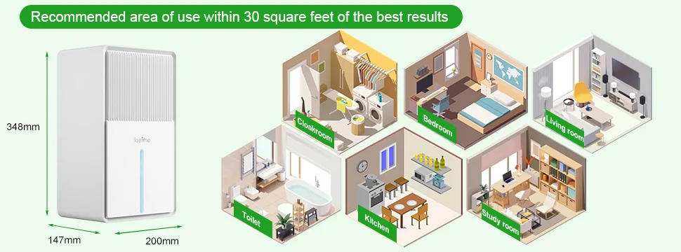 Upgraded Powerful DehumidifiersStill annoyed about the Wet Room, Moldy Clothes, Moisture closet, Damp Floor? Is it not environmentally friendly to use disposable dehumidifiers? The LOEFME dehumidifiers for home performance of upgraded 50% more than others with semiconductor refrigeration and powerful suction fan. Max collect 26.5 OZ (800ml) of water per day (at 30, 80% RH ). Ideal for spaces 0-200 sq ft.it is the first choice for dehumidifying closets.