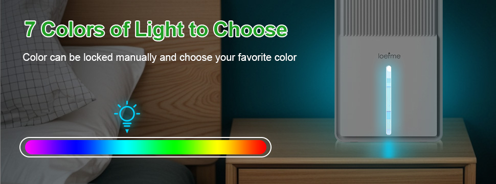 Auto Shut off & Colorful Night LightsThe visualized 99 OZ (3000ml) water tank is easy to take out, clean. This mini dehumidifier will auto shut down when the water tank reaches full, and the red light will flash to remind. No worry about water overflow. 7 colorful lights provide the light you need when getting up at night. (Note: Colors can be steady on and turned off ).