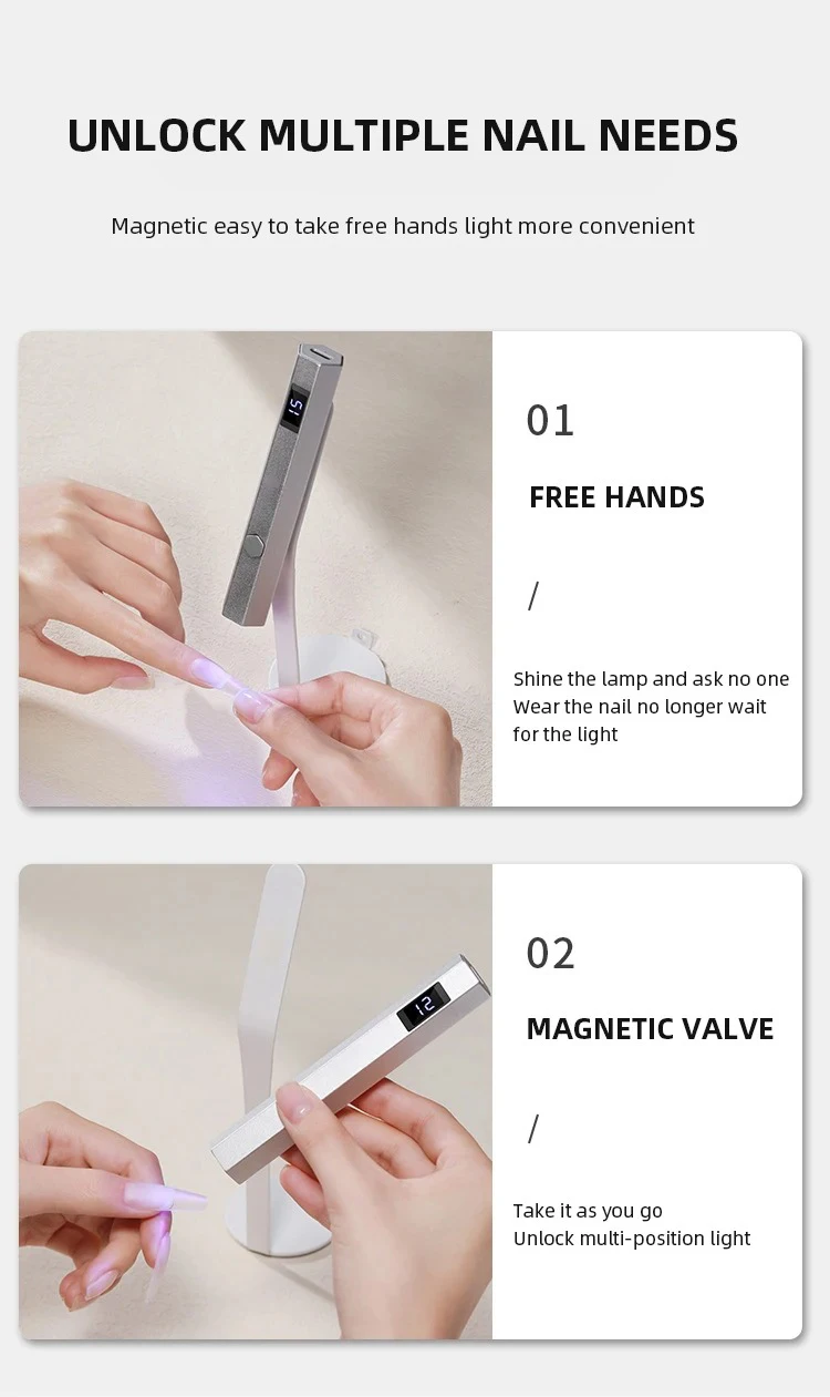 Rapid drying cure light comes will provide adequate light source to shorten the curing time but without hurting your hands, it can fast dry all kinds of manicure gel, flexible, time saving, no glaring and no black hurting on you hand.
