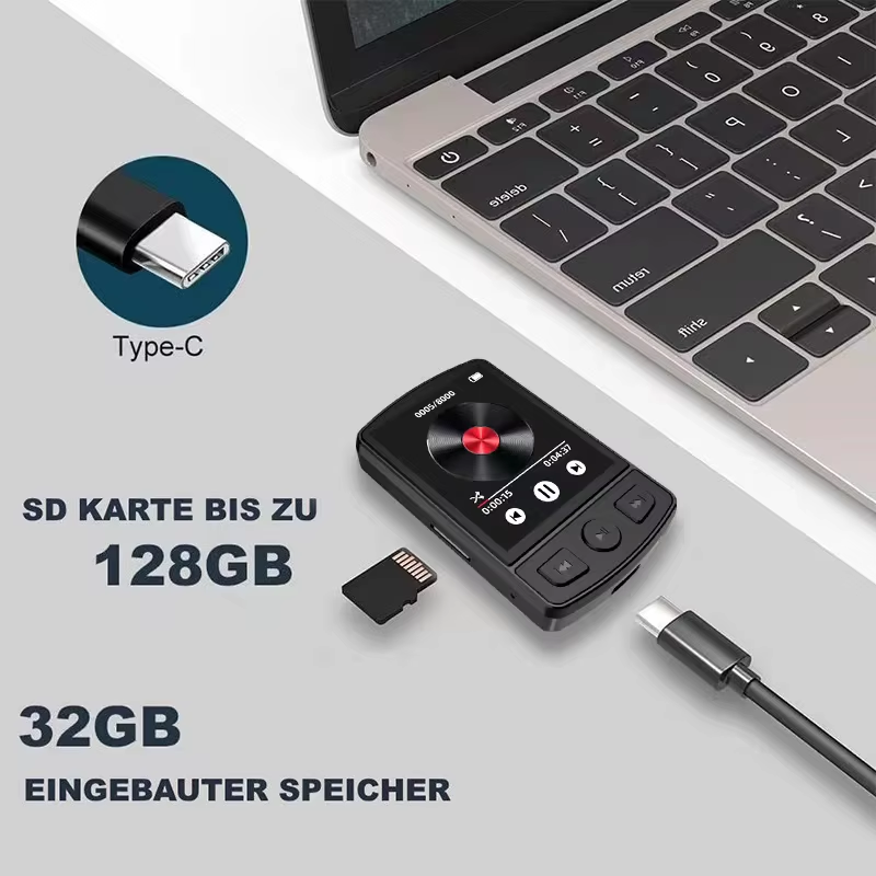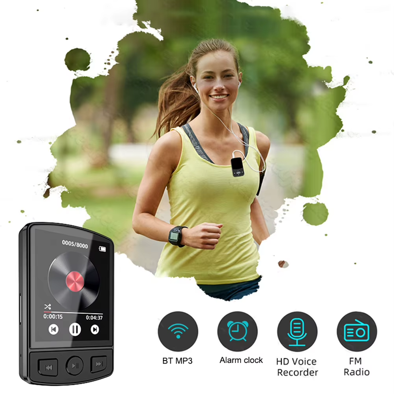 1.8 Inch Screen MP3 Player Portable Sport Clip Walkman HiFi Sound Bluetooth-Compatible 5.2 Wearable Music Player Button Built-in speaker with FM Radio E-Book Alarm clock Multiple languages Feature: 1. Clip-on Design: Portable and sturdy clip design prevents accidental drops. Simply attach the MP3 player to your jeans, t-shirt, workout gear, or backpack. Take it with you wherever you go. 2. Hi-Fi Lossless Sound Quality: This portable sport clip walkman uses professional intelligent noise reduction chips and exquisite noise reduction technology, offering higher quality sound than previous MP3 models. Immerse yourself in the world of music with pristine audio. 3. Bluetooth-Compatible 5. 2 Connectivity: The latest Bluetooth-Compatible V5.2 version ensures stronger connectivity, transmission, and stability. Enjoy a reliable Bluetooth-Compatible range of up to 10 meters. Connect your headphones and Bluetooth-Compatible speakers to listen to your favorite music wirelessly. 4. Multifunctional: The wearable music player not only features music playback but also supports recording, FM radio, TXT format e-books, picture browsing, and AMV video playback. It's a must-have for studying, working, running, traveling, fitness, and more. 5. Mini Portable Design: Classic button design with a 1.8-inch small screen allows for easy pocket storage. This clip-on ultralight mp3 player weighs only 35 grams, making it almost unnoticeable. Its sturdy sports clip lets you enjoy your favorite music on the go. Specification: Note: 1 x MP3 Player