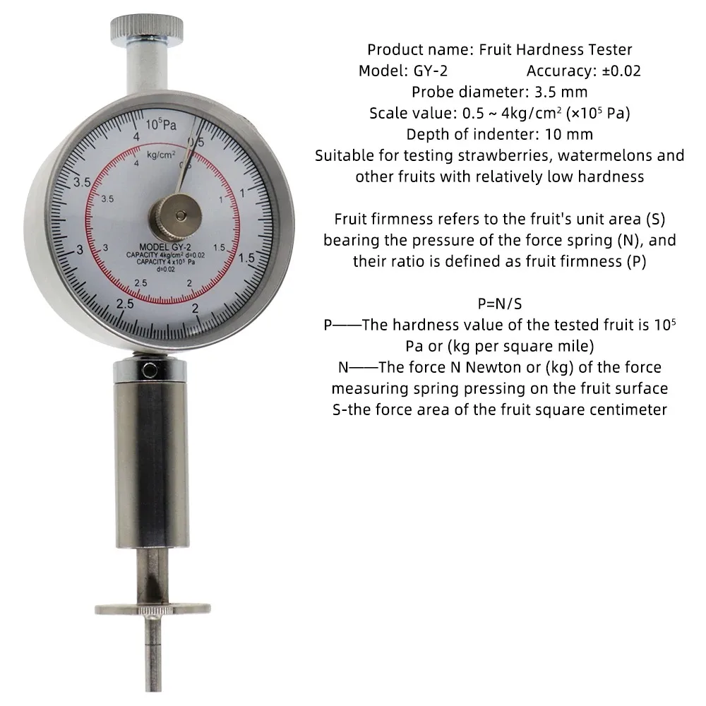 The fruit sclerometer (also called fruit hardness tester), this series has GY-1, GY-2, GY-3three kind of models, use to testing apple, pear, Strawberry, grapes fruits hardness. It is suitable for the fruit tree scientific research department, the fruits company, the fruit tree farm, unit and so on technical college agriculture colleges and universities, to cultivate the improved variety, the harvest storage, the product transportation and the processing and so on by the fruits hardness. Thus judge fruits mature degree. This instrument volume small, the weight is light, straight reads the type, carries conveniently, specially is suitable for the scene determination, the result came out direct.