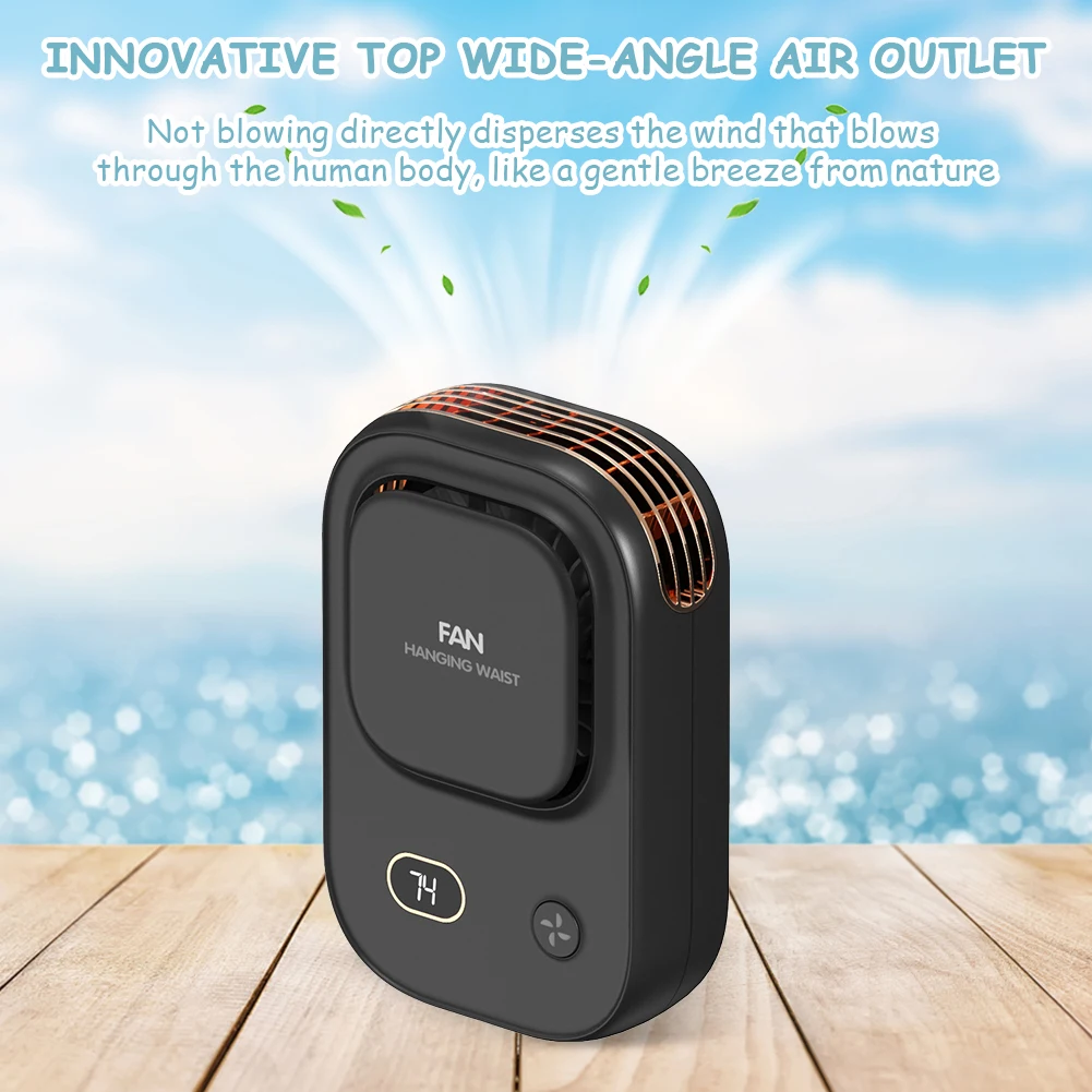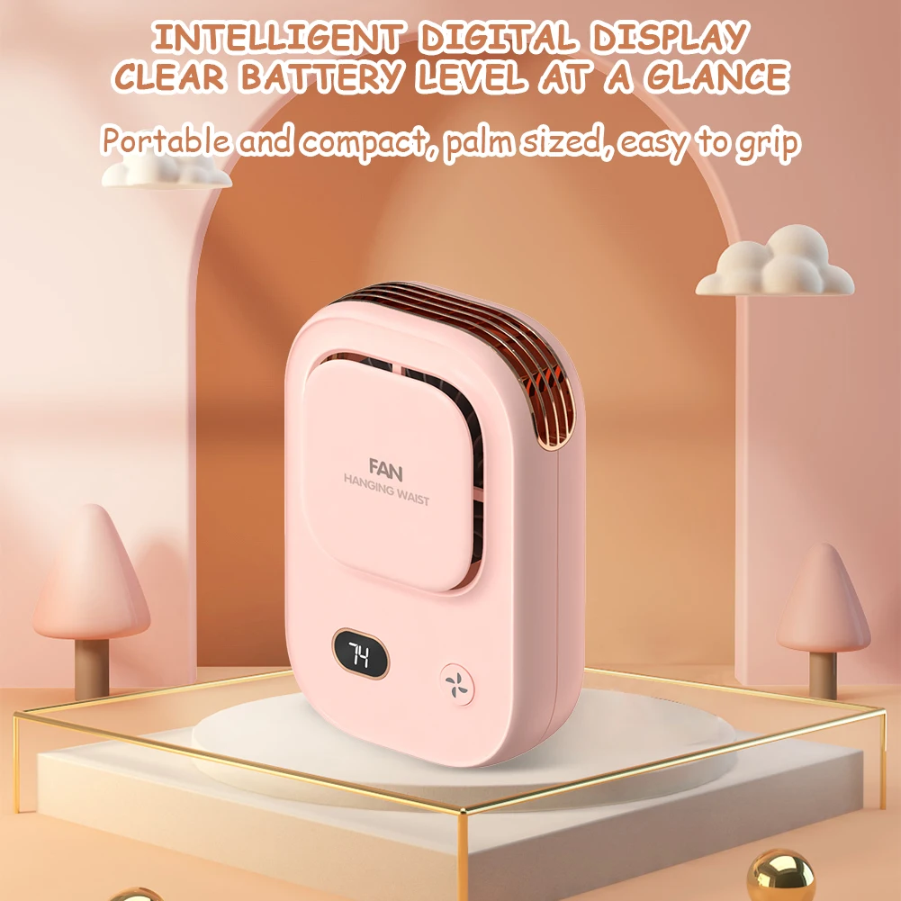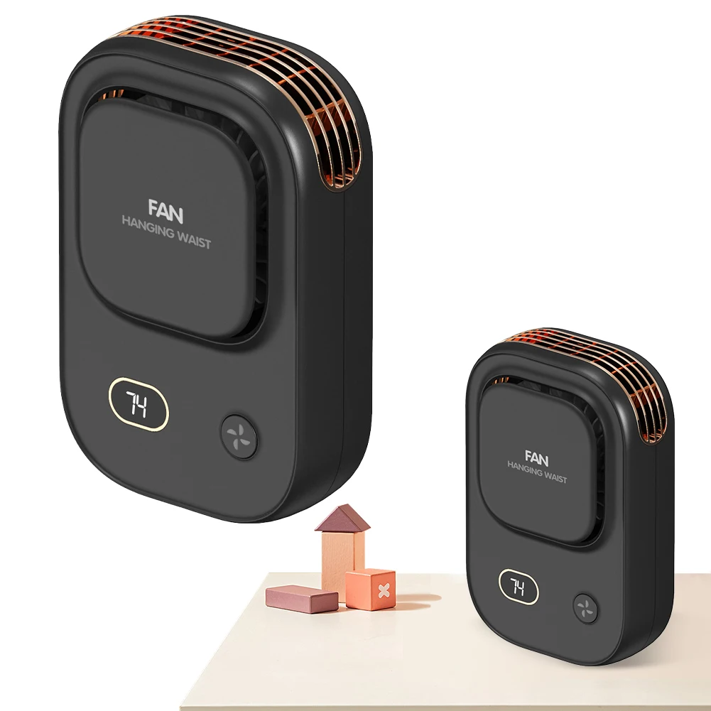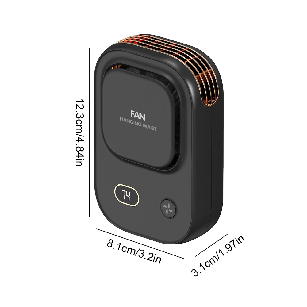 Portable Waist Clip Fan Wearable Belt Fan 2000mAh Battery Operated Rechargeble Belt Clip Fan 3 Speed for Camping Outdoor Jobsite Features: 1. Innovative Airflow Design: The top-mounted wide-angle airflow of portable waist clip fan ensures a gentle breeze that doesn't directly blow onto the body, mimicking the sensation of a natural and soothing wind. 2. Lightweight and Portable: With wearable belt fan's lightweight body, you can comfortably hang it around your neck all day without feeling any burden. Stay cool wherever you go, without any hassle. 3. Adjustable Multi-Speed Settings: Enjoy personalized comfort with the three-speed airflow options of hands-free hanging neck fan. Easily adjust the fan speed to your preference, enhancing your overall cooling experience. 4. Versatile Stand Design: The innovative stand design allows for convenient placement on your desk or the option to hang it using a strap around your waist. Choose the most convenient setup for your cooling needs. Experience continuous cooling throughout the day with its long-lasting battery. Stay refreshed and cool without interruption. It's not just a belt clip fan, but also a trendy accessory that injects vitality and youthful energy into your style. 5. Intelligent Battery Display: The smart LED display shows the remaining battery level at a glance, providing you with clear information about the power status. Its compact size fits perfectly in your hand, ensuring a comfortable grip. The body fan features a versatile Type-C input, allowing for unrestricted charging options. Stay connected and powered up without limitations.