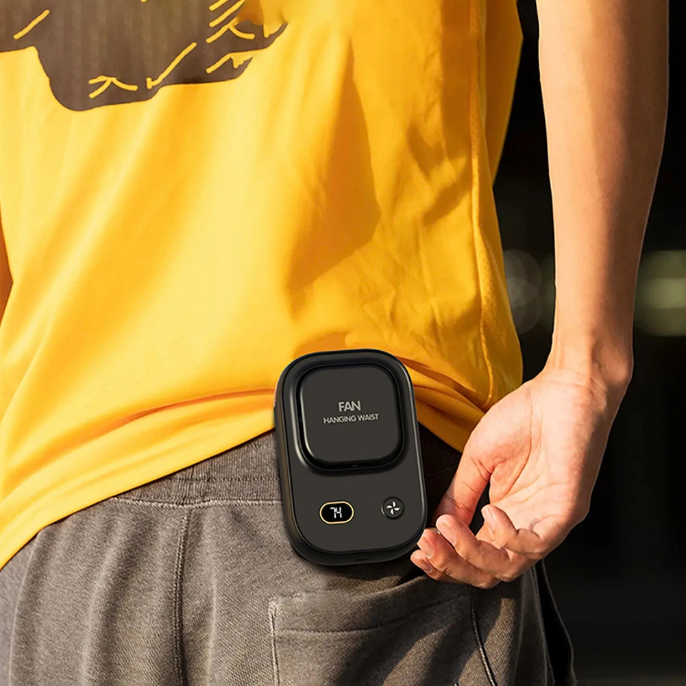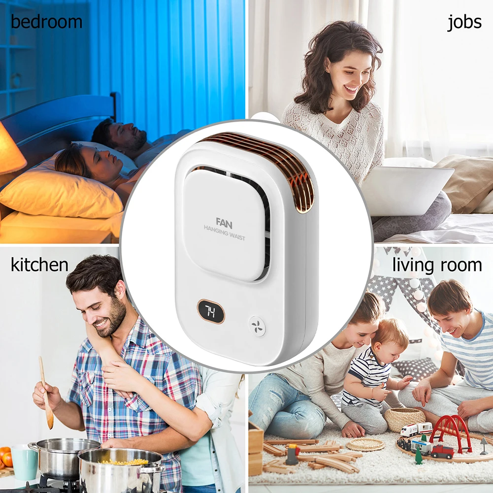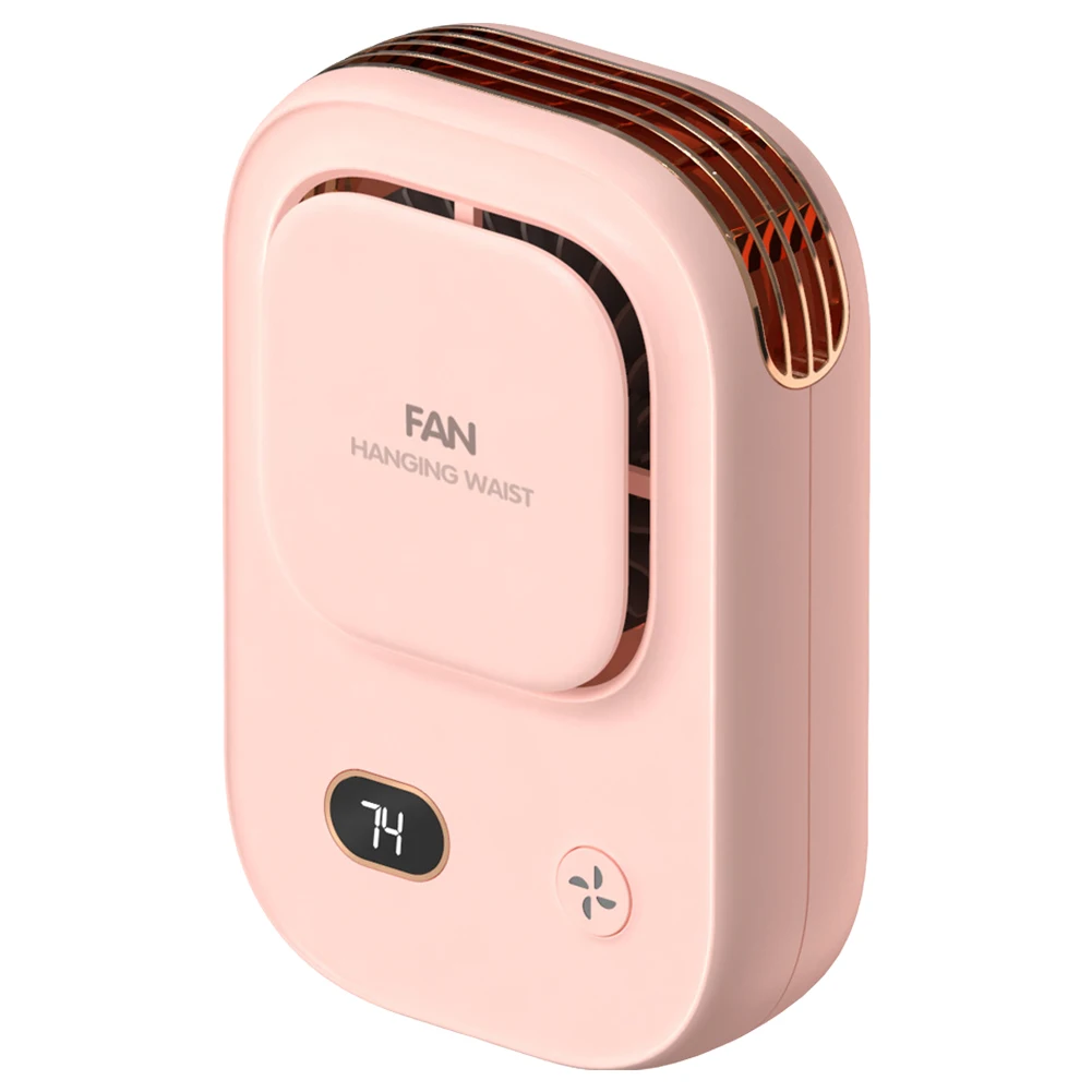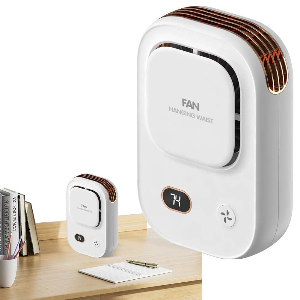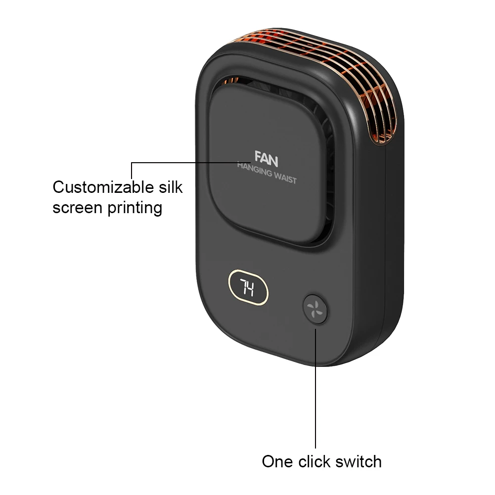 Portable Waist Clip Fan Wearable Belt Fan 2000mAh Battery Operated Rechargeble Belt Clip Fan 3 Speed for Camping Outdoor Jobsite Features: 1. Innovative Airflow Design: The top-mounted wide-angle airflow of portable waist clip fan ensures a gentle breeze that doesn't directly blow onto the body, mimicking the sensation of a natural and soothing wind. 2. Lightweight and Portable: With wearable belt fan's lightweight body, you can comfortably hang it around your neck all day without feeling any burden. Stay cool wherever you go, without any hassle. 3. Adjustable Multi-Speed Settings: Enjoy personalized comfort with the three-speed airflow options of hands-free hanging neck fan. Easily adjust the fan speed to your preference, enhancing your overall cooling experience. 4. Versatile Stand Design: The innovative stand design allows for convenient placement on your desk or the option to hang it using a strap around your waist. Choose the most convenient setup for your cooling needs. Experience continuous cooling throughout the day with its long-lasting battery. Stay refreshed and cool without interruption. It's not just a belt clip fan, but also a trendy accessory that injects vitality and youthful energy into your style. 5. Intelligent Battery Display: The smart LED display shows the remaining battery level at a glance, providing you with clear information about the power status. Its compact size fits perfectly in your hand, ensuring a comfortable grip. The body fan features a versatile Type-C input, allowing for unrestricted charging options. Stay connected and powered up without limitations.
