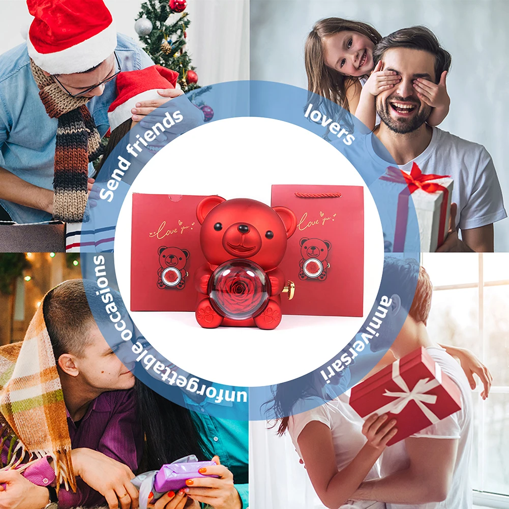 1. Charming Bear Design with Hidden Surprise: This cute bear gift box features an adorable teddy bear encased with a stunning preserved rose. A golden heart-shaped knob reveals a hidden jewelry compartment, adding an element of surprise and delight for your loved one.