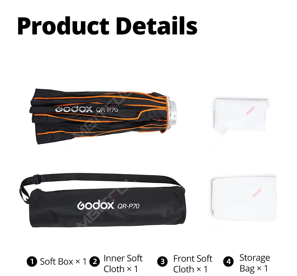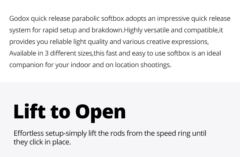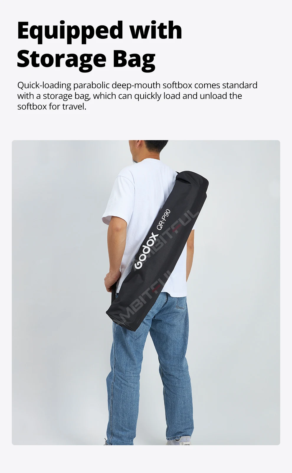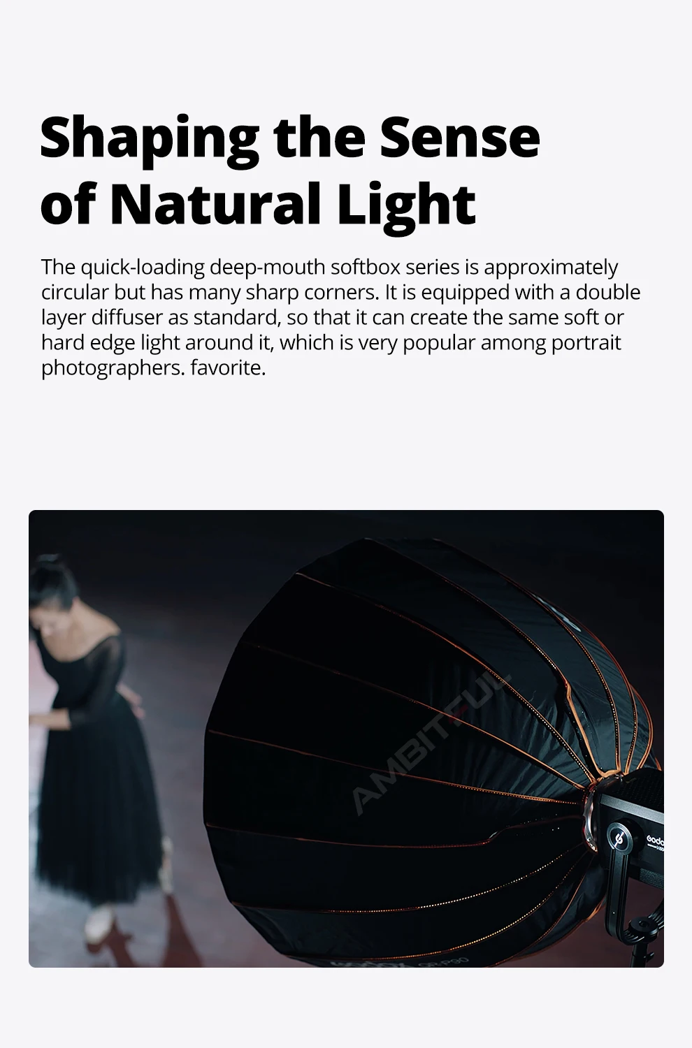 The QR series softboxes are new multi-purpose deep parabolic softboxes launched by Godox. The unique quick-loading design makes it easy to disassemble and store, which greatly improves shooting efficiency while maintaining the brightness, color temperature, and high CRI of the light source; the QR series Softbox has the advantages of large depth, rich layers, uniform illumination, and soft light effects. It is an ideal choice for video shooting, live recording, and interview lighting.