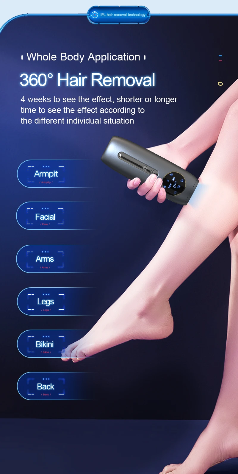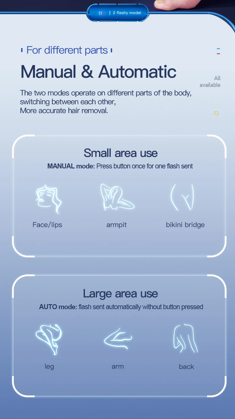 3. Experience the personalized hair removal with the 4 specialized modes tailored for your facial, bikini, armpit and leg areas, achieve smooth radiant skin effortlessly