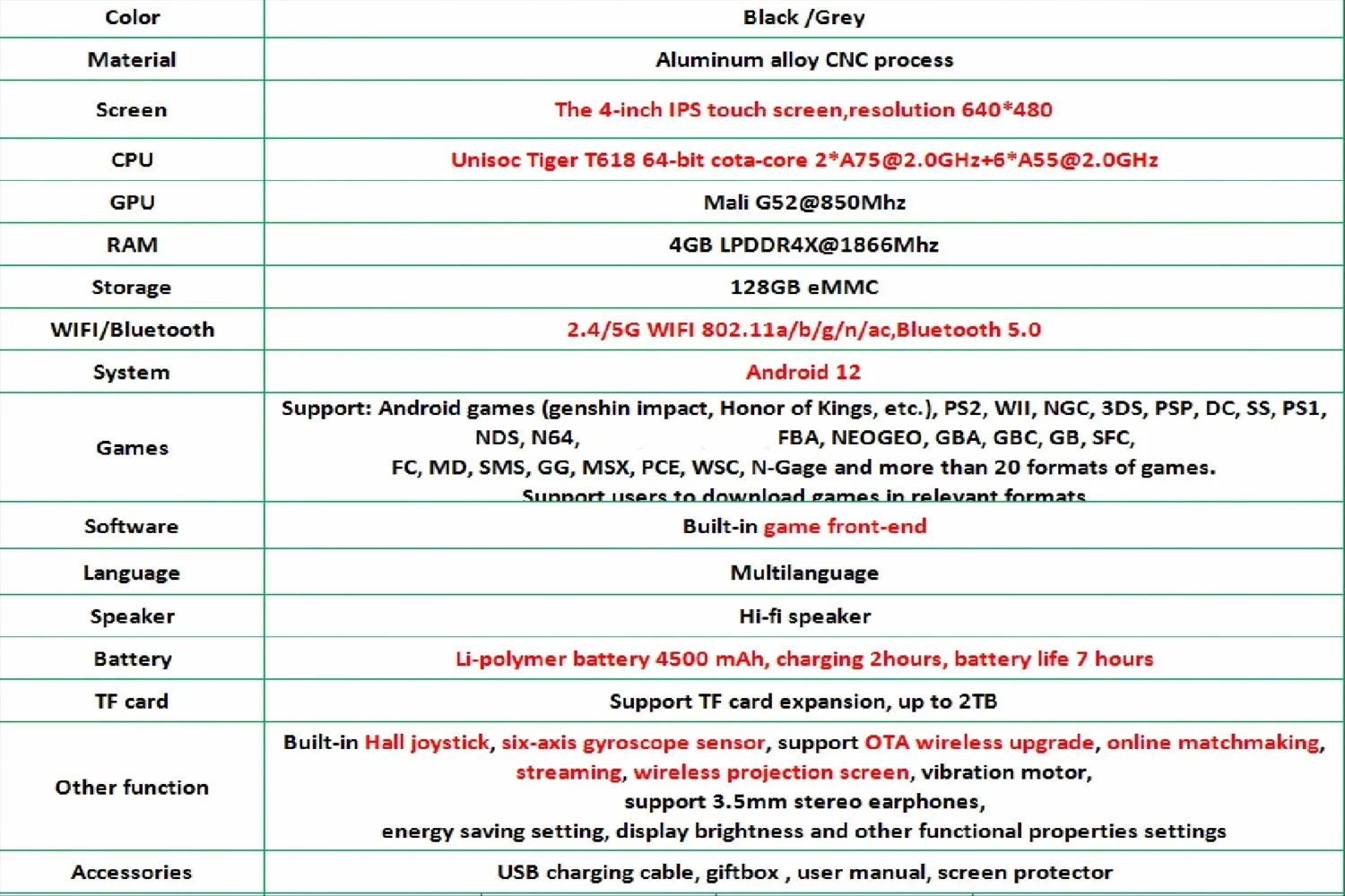 Crafted with the highest-quality materials, including aluminum alloy CNC processing, this console is built to last. The console features a 4-inch IPS touch screen with a resolution of 640*480, providing a crisp and clear picture for all of your favorite games.