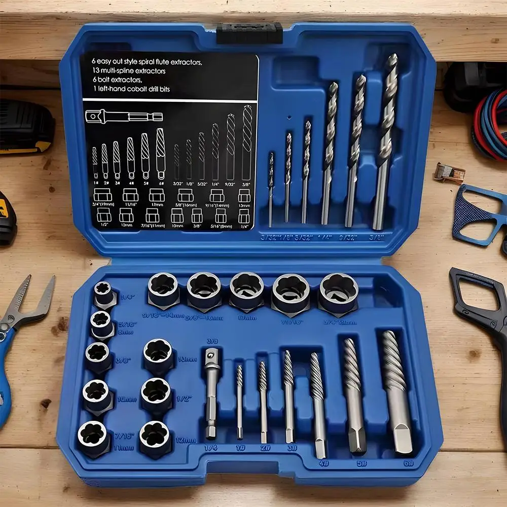 1.Multifunctional Tool: Equipped with 6-piece chrome-molybdenum screwdriver set and high-speed steel drill set in various sizes, including 13 nut drivers for versatile and effective usage2.Long-term Use: Constructed with excellent materials known for high hardness and rust-proof properties, this kit ensures toughness and long-lasting performance in bolt extraction tasks