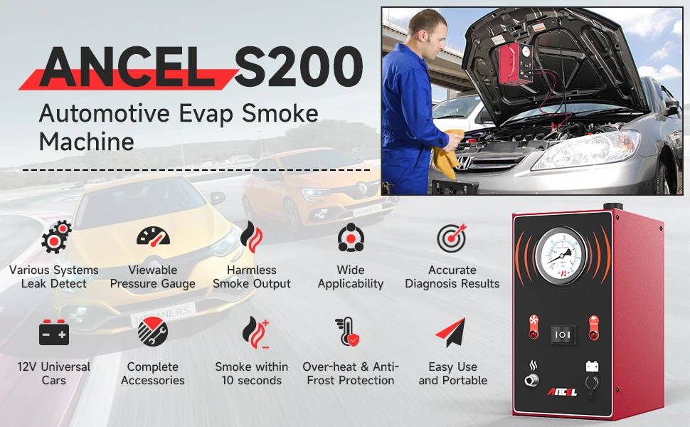 ANCEL S200 Car Smoke Leak Detector is a professional auto pipe leak detect tool and has built-in air pump, It will help us position cars motorcycles leakage on pipe system quickly and exactly ,such as : Intake System Test, Exhaust Systems Test, Car Sealing Test, Fuel Tank System Test.
