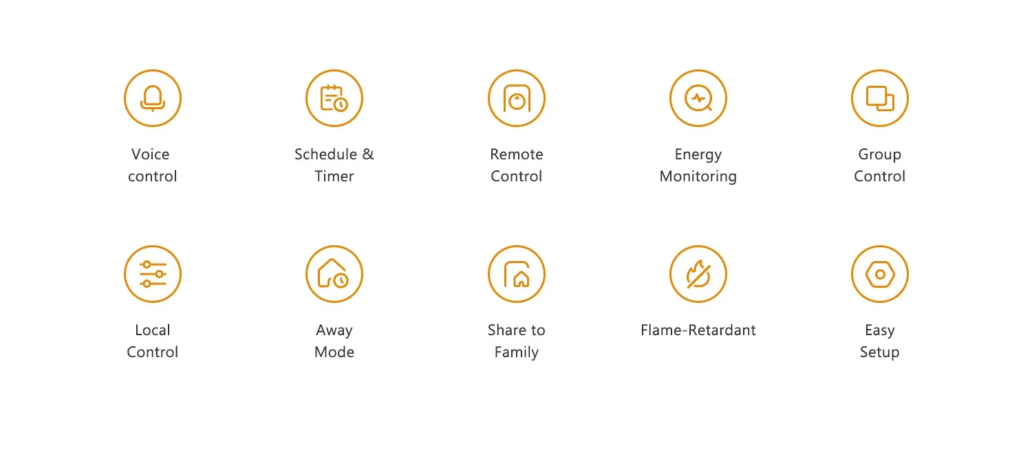 Voice control | Schedule&Timer | Remote Control | Energy Monitoring | Group Control | Local Control | Away Mode | Share to Family | Flame-Retardant | Easy Setup
