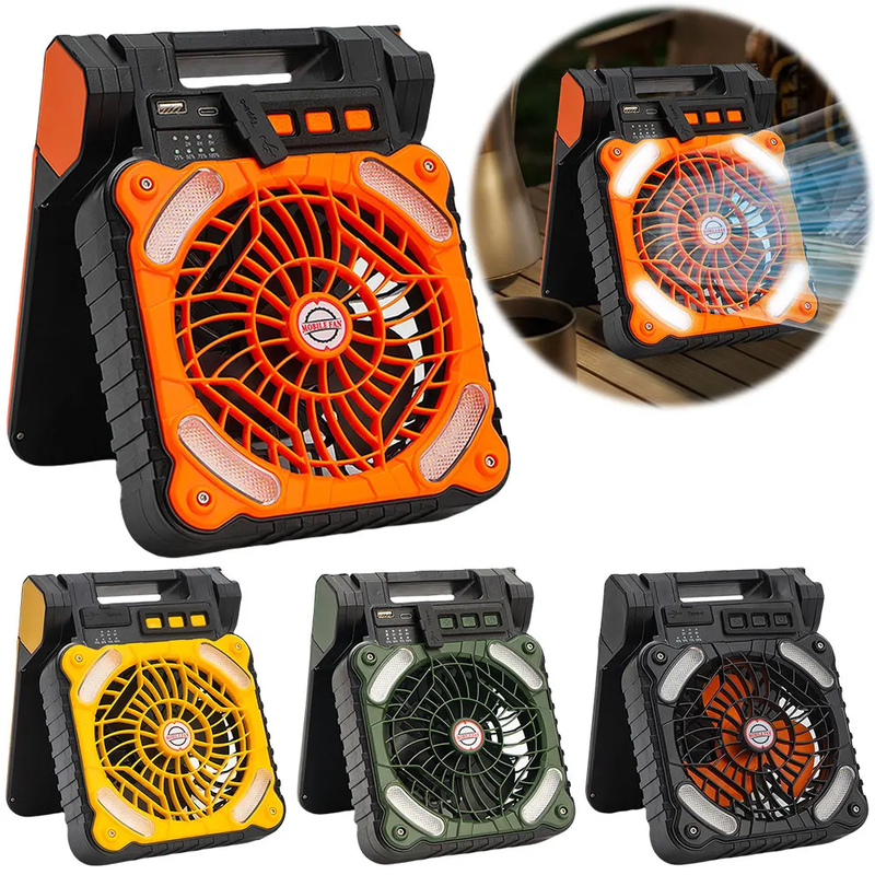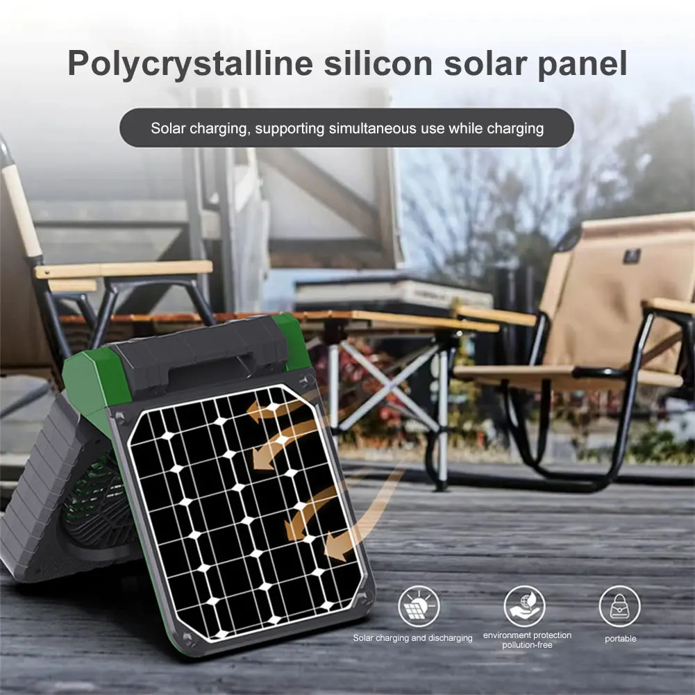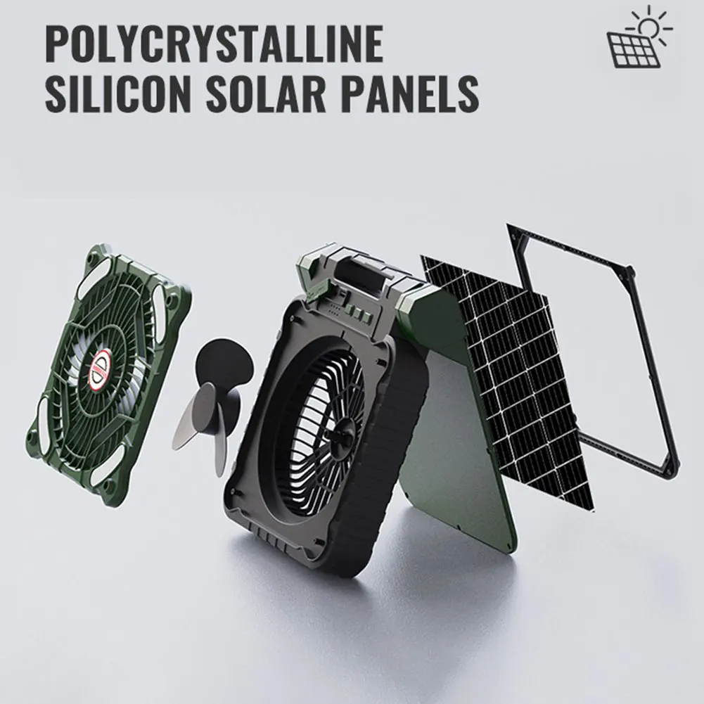 1.Solar-Powered Versatility: This solar outdoor camping fan is equipped with a solar panel, enabling simultaneous charging and usage. With high photoelectric conversion efficiency, it can charge even in low-light weather.