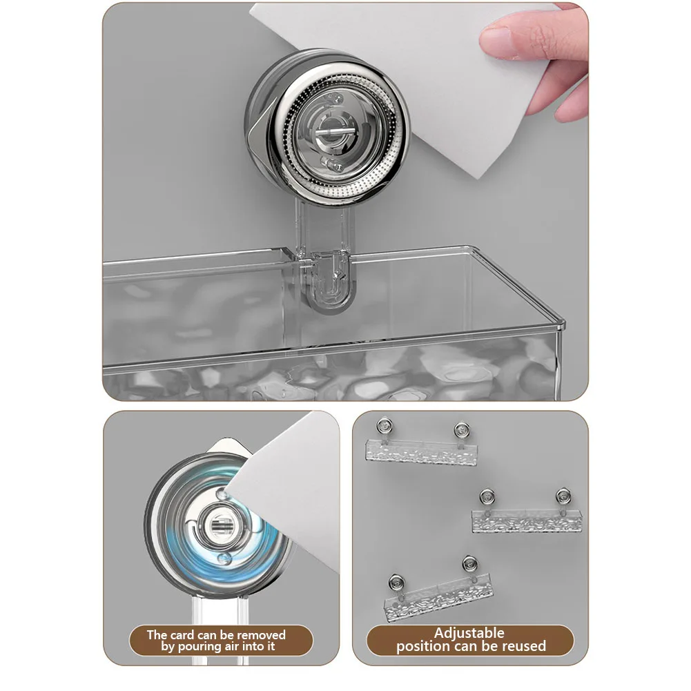 1.Effortless Installation: The bathroom storage shelf with suction cups requires no tools or drilling. Easily mount it on smooth surfaces without damaging the walls, allowing for quick repositioning and reuse.