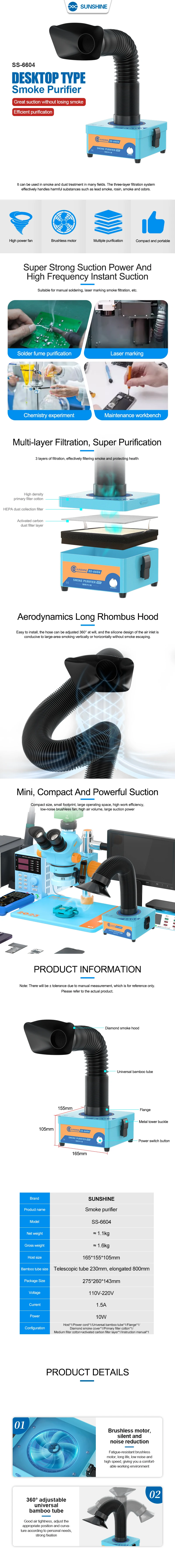 SUNSHINE SS-6604 Portable Mini Fume Extractor Welding Smoke Absorber 3 Layer Filter Dust Purification System for Phone Repair