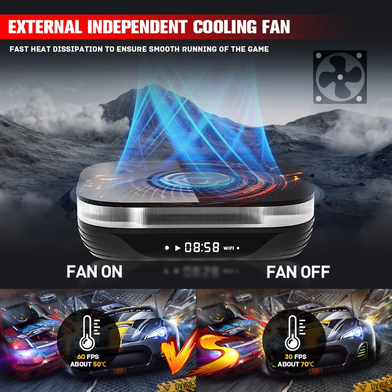 The built-in uniquely designed cooling fan starts/stops automatically when the console is turned on/off,with high-quality heat sinks,cooling down quickly.Keep the temperature of the chip always at about 50,avoid overheating and frame drop problem.Ensure long gaming time without lag or freezing.