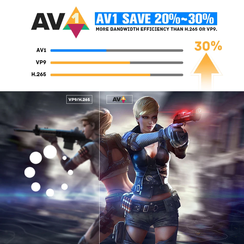 AV1 Save 20%~30% more bandwidth efficiency than H.265 or VP9. Compared with other consoles, the game loading speed of this console is faster, smoother, and the picture is clearer.