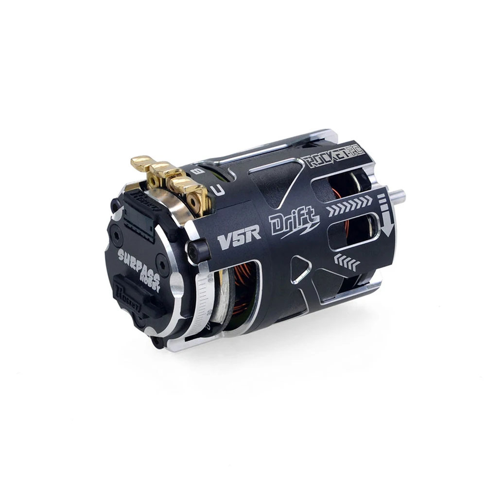 SURPASSHOBBY ROCKET 540 V5R brushless pole-speed motor meets the requirements of ROAR (USA) competition and IFMAR rules. It provides 3.5T 4.5T 5.5T 6.5T 7.5T 8.5T 9.5T 10.5T 13.5T 17.5T 21.5T for all kinds of T numbers. It is suitable for F1, 1/12, 1/10 off-road, drift and electric car races. CNC6061 aluminum alloy shell, induction line interface, aluminum tail cover; ultra-low internal resistance, improve motor performance and reduce motor operating temperature, optimize heat dissipation efficiency, disassembly and adjustable timing.