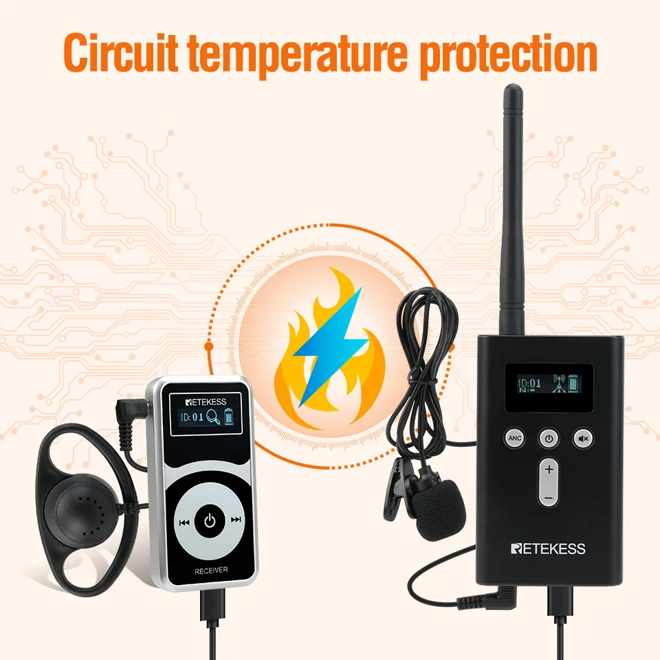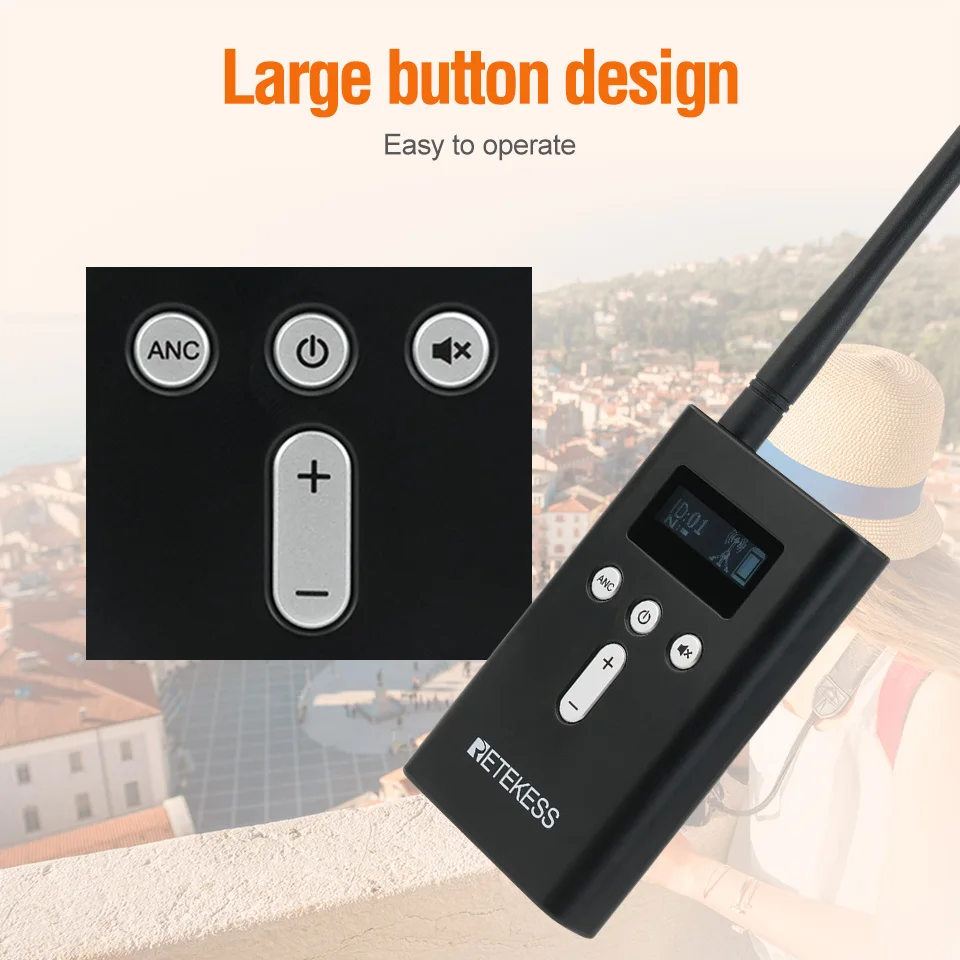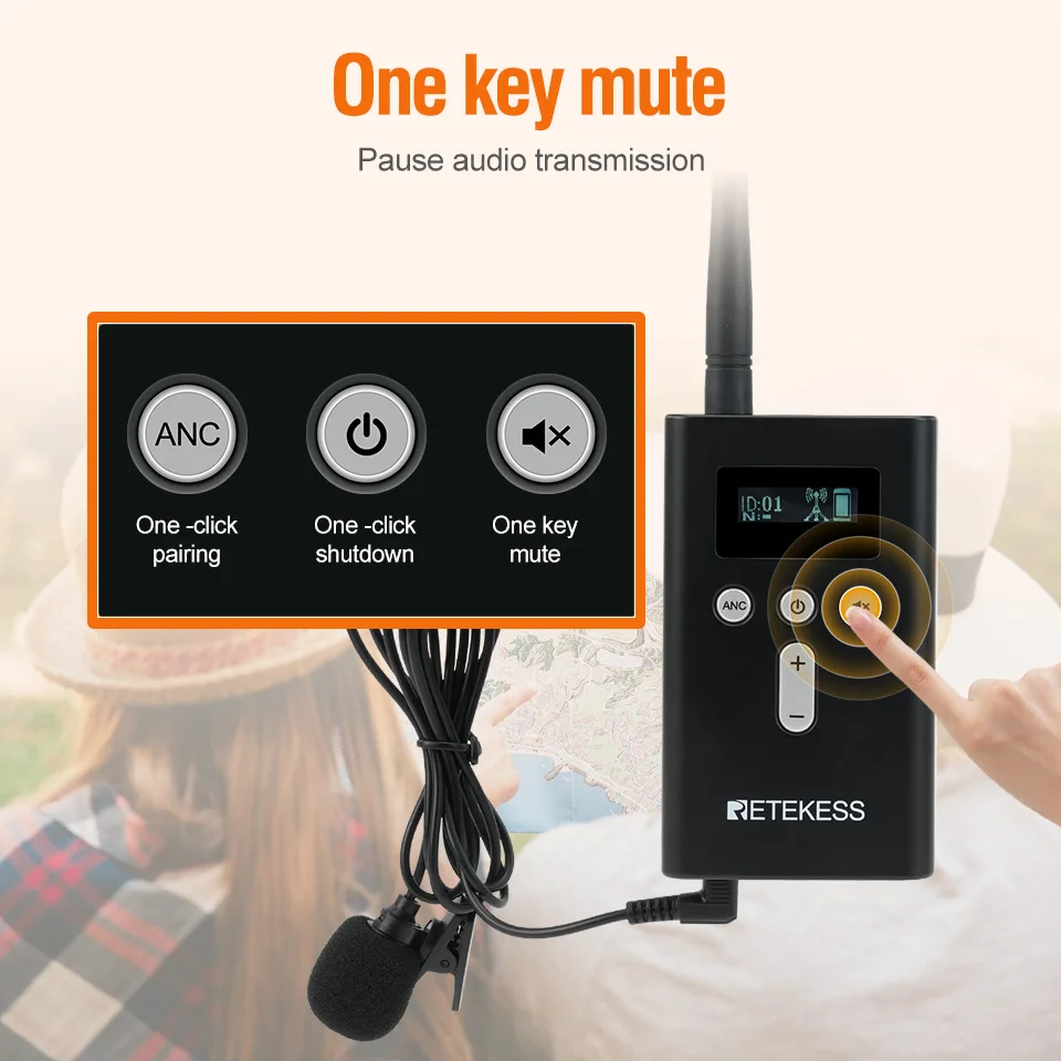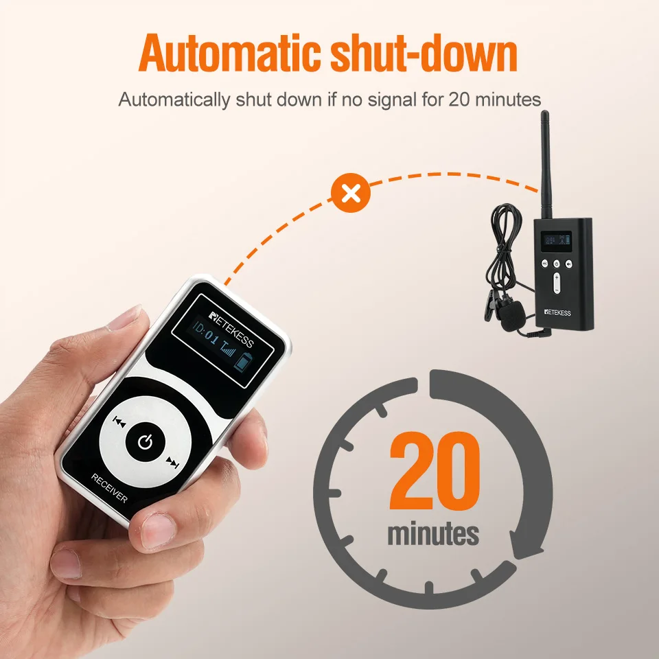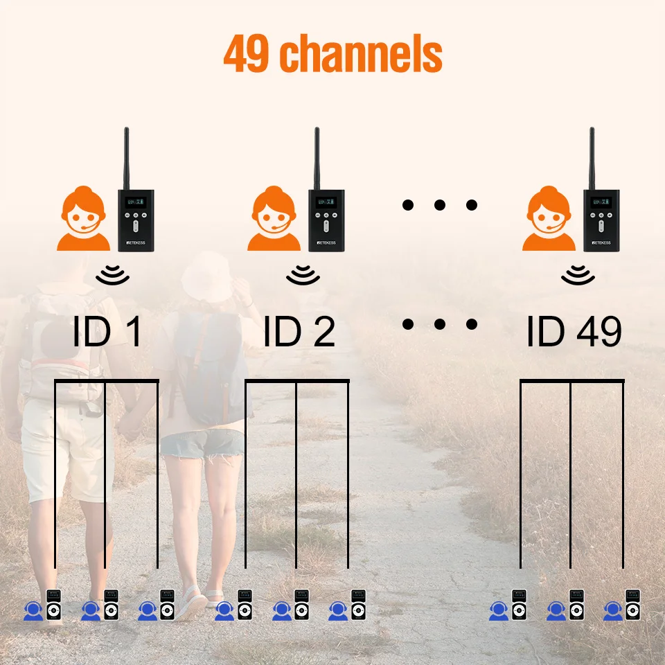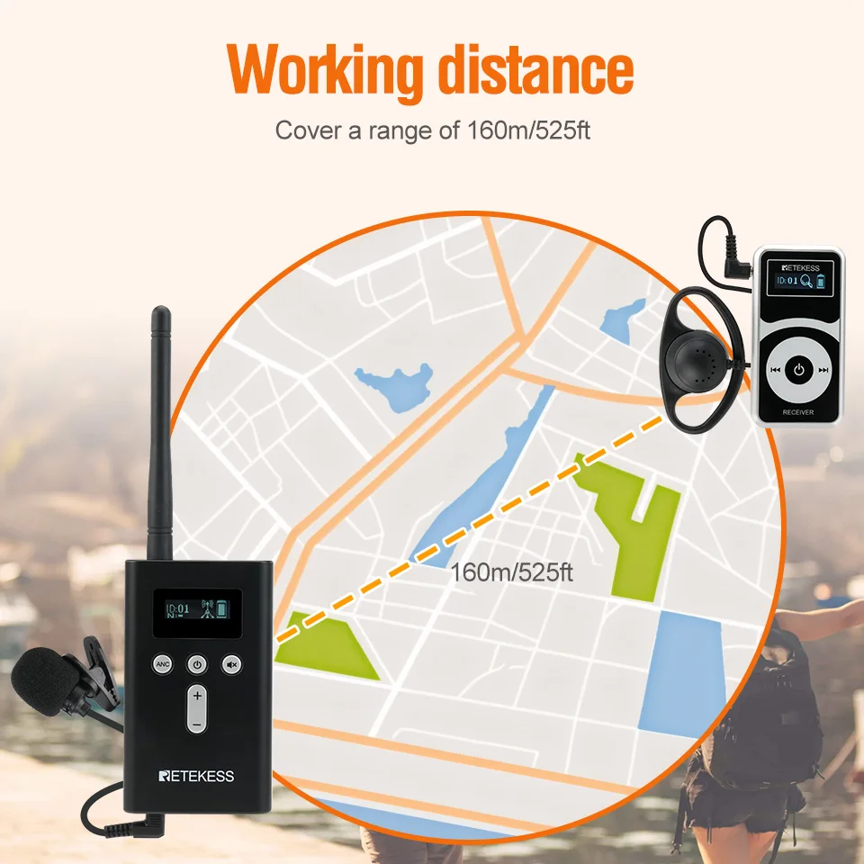 The wireless tour guide system adopts advanced technology to effectively filter out background noiseTransmission distance is about 160m/525ft.It helps tour groups keep social distancing.Built-in rechargeable lithium battery, working time up to 36 and 20 hoursAutomatic shut-down; the function can prompt the device to be in standby mode; this helps reduce energy waste and reminds you the device using time49 channels; using different channels can effectively reduce interference; thereby ensuring clear and correct transmission of informationThe transmitter can mute its own mic sound with one click to prevent the receiver from hearing it.Monitors temperature for comprehensive circuit temperature protectionUse """-" keys to adjust the channel, and then press and hold the power key to enter the pairing mode.You can adjust the volume to a comfortable level and bring you a good experience10 levels of volume; different situations may require different volume settings; 10-level volume adjustment allows you to achieve balance between different sounds2 charging methods; when type-c charging cannot be used; you can choose contact charging to ensure that the device is charged and used normally