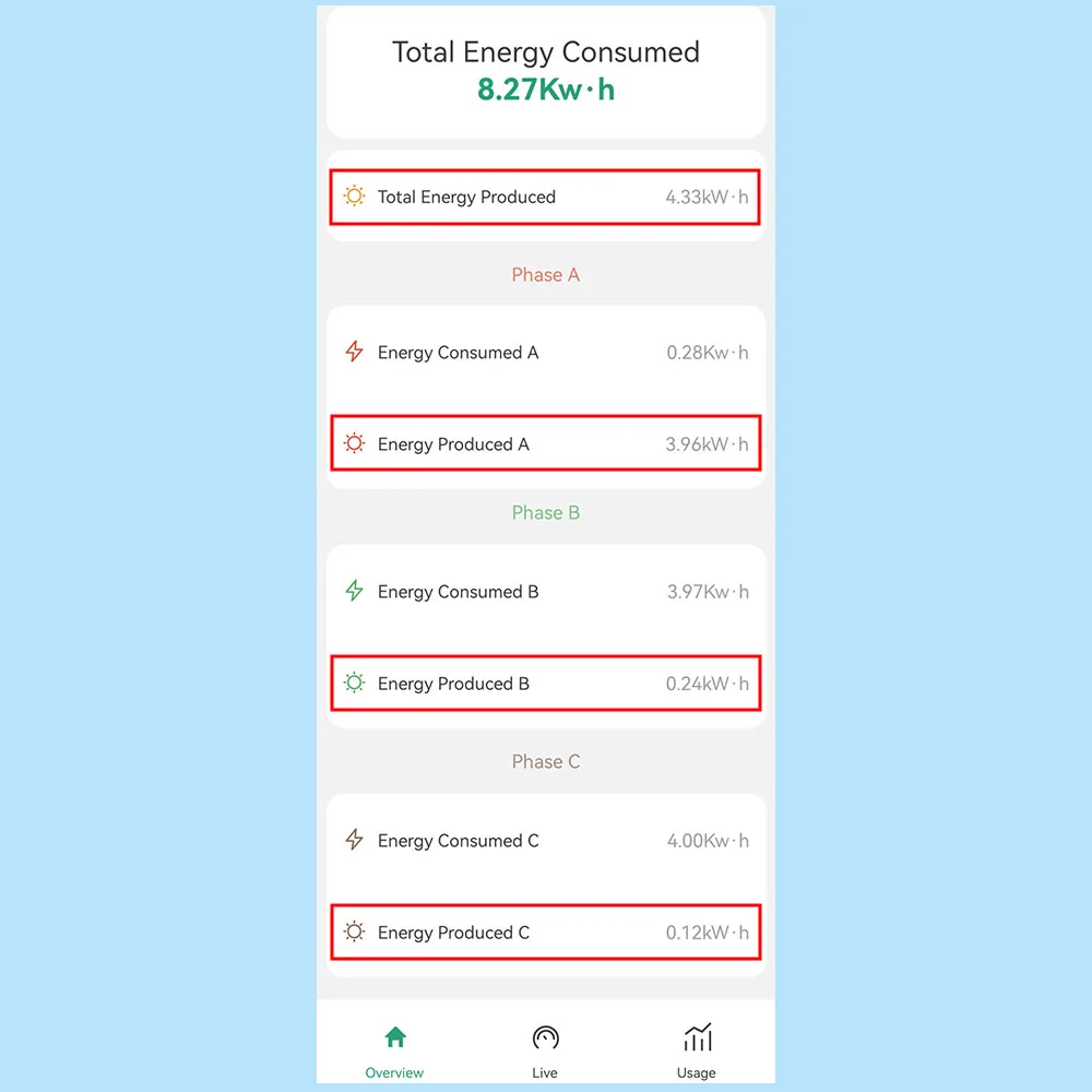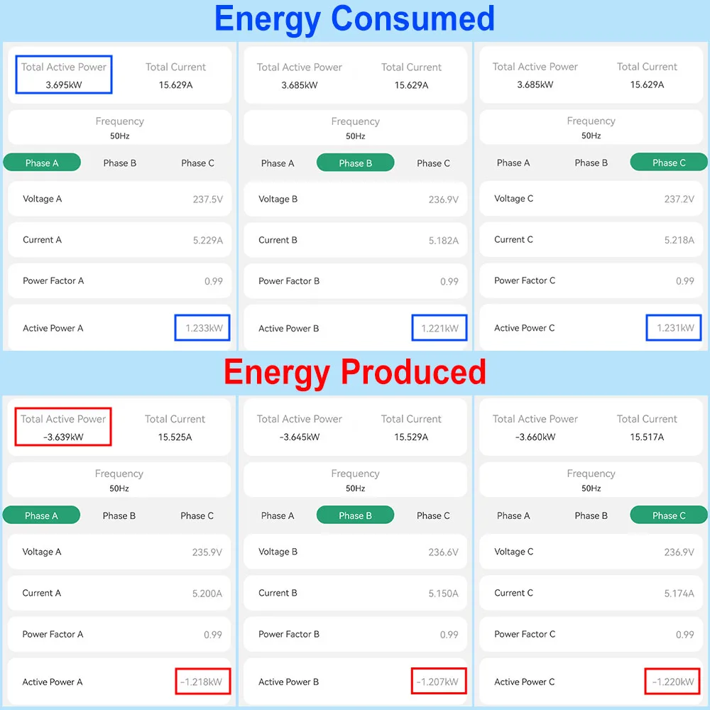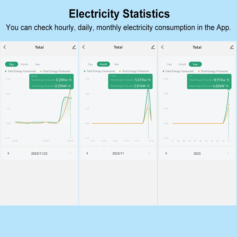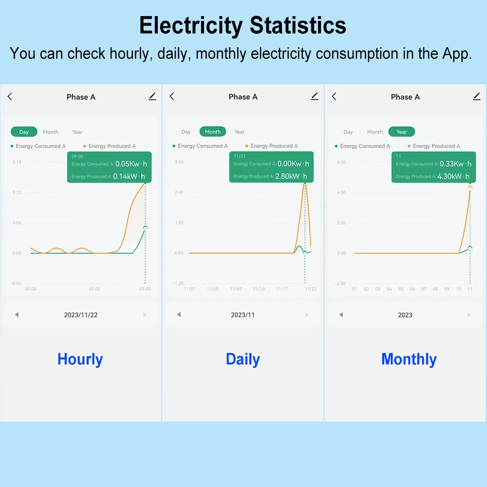 For 80A-300A CT item, it has electric statistic function, you can view KWh power consumption by hour, by day, by month, and by year, and total 3 phase energy consumption