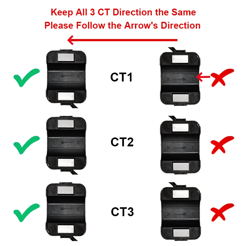 When you install the CT , please note the CT's direction, make sure all 3 CT with the same direction.