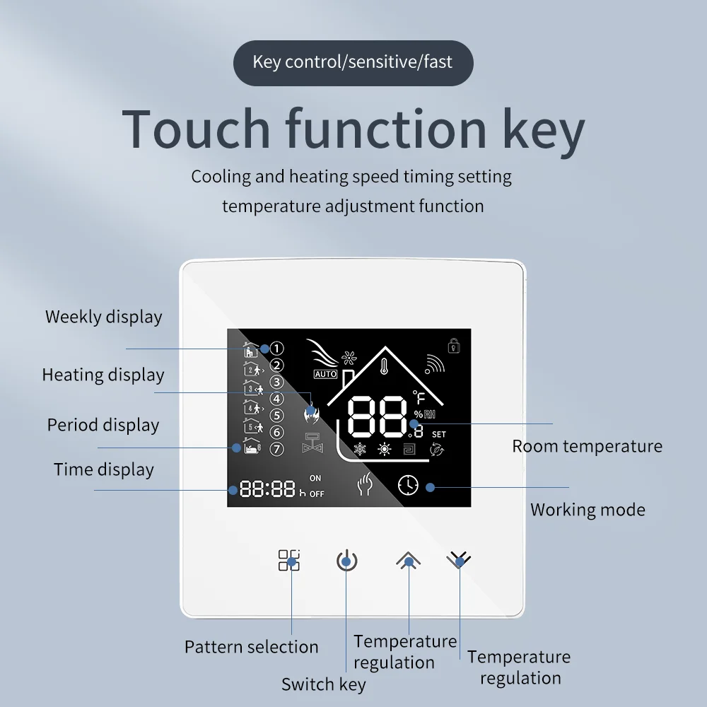 The digital thermostat adopts microcomputer control technology and has anelegant design, and is easy to use. Moreover, it has manual and automaticfunctions, programmable functions, and state memory functions.