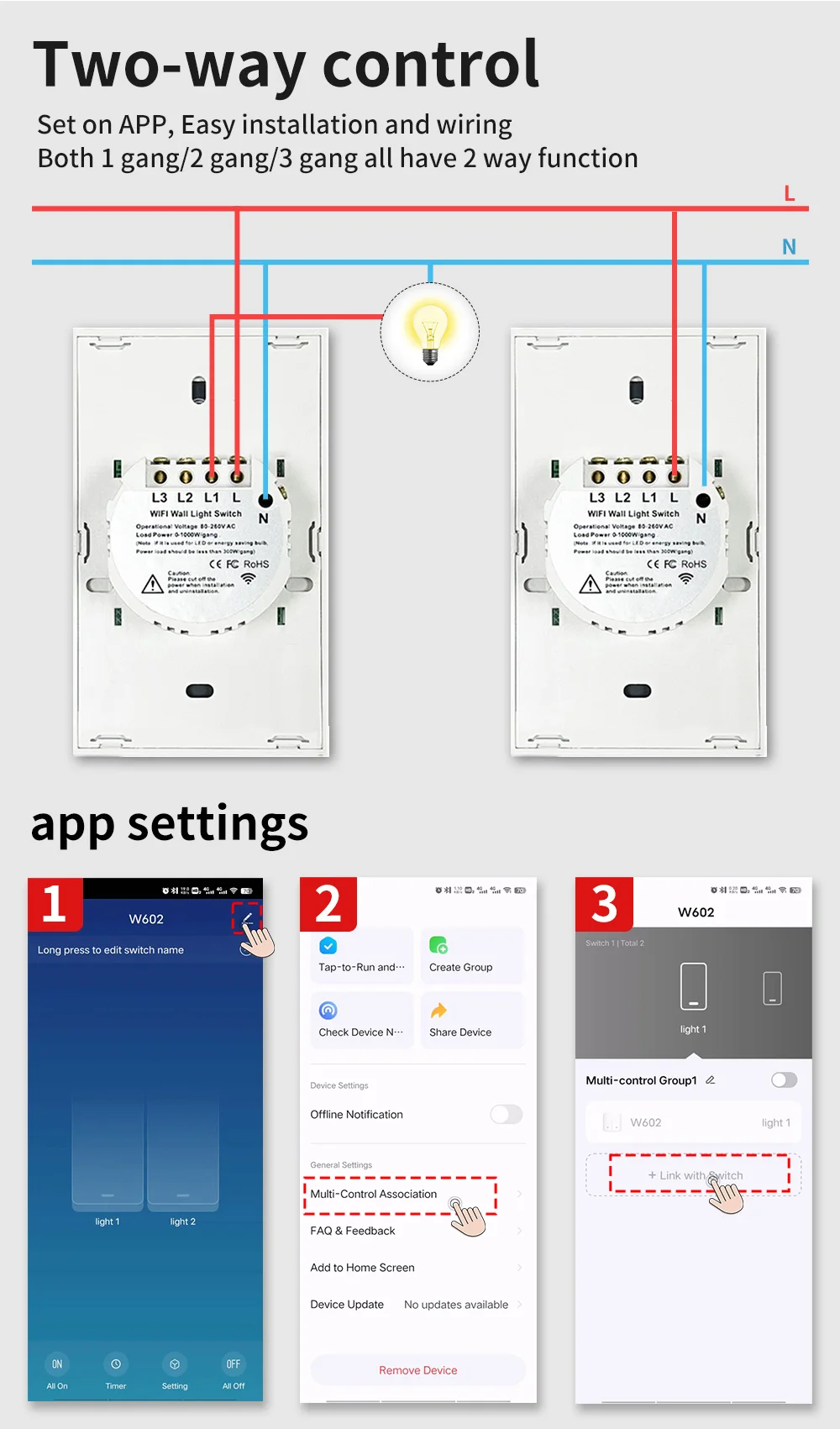 The switch is compatible with Alexa and Google Home Assistant, allowing you to use the voice control smart switch to turn on/off.