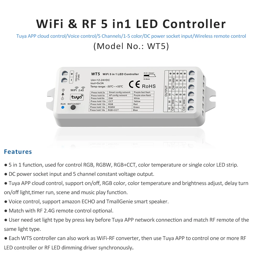 Tuya Wifi RGBCCT LED Controller DC12-24V WT5 5In1 LED Dimmer 2.4G RF 1-Zone 4-Zo