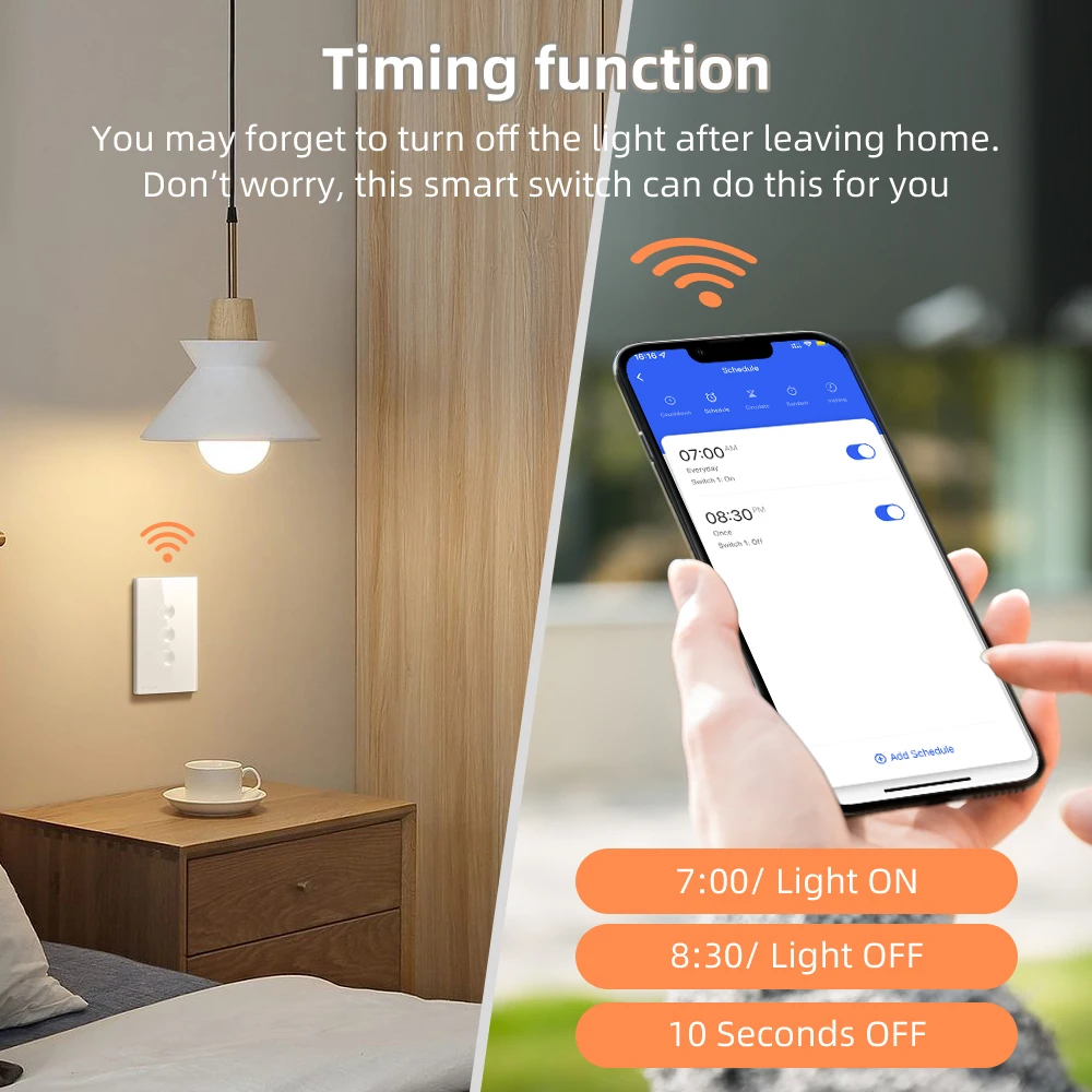 [ Timing Function ] - Set schedule to the switch ,turn on/off light according to your schedule. Also the switch have extra timing countdown Circulate,Random,Inching function.