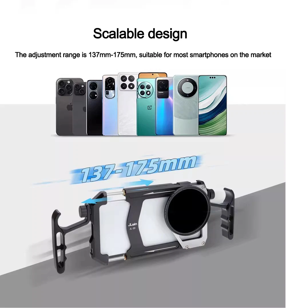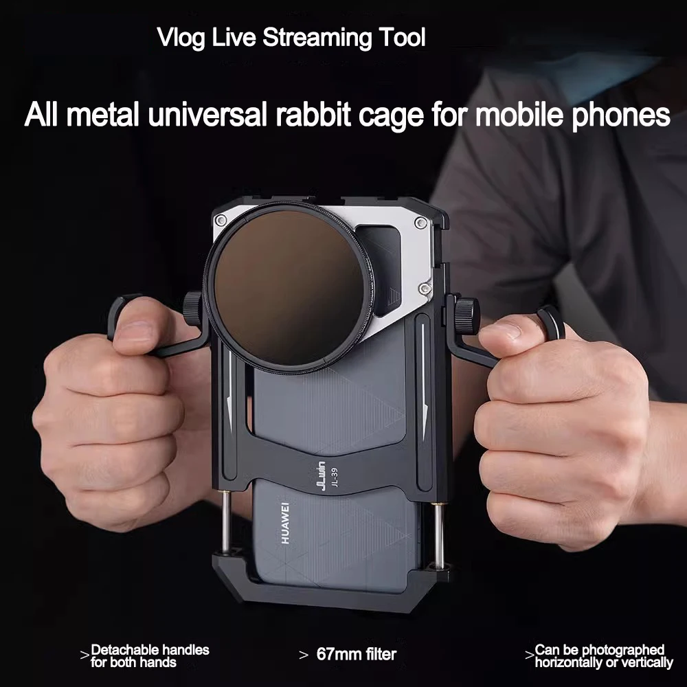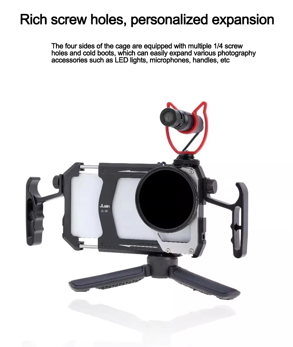 This product is a general-purpose mobile phone rabbit cage, which can hold the mobile phone in various modes to take pictures. It can be held in one hand, two hands, hand-held, and can be installed on a tripod for horizontal and vertical shooting.