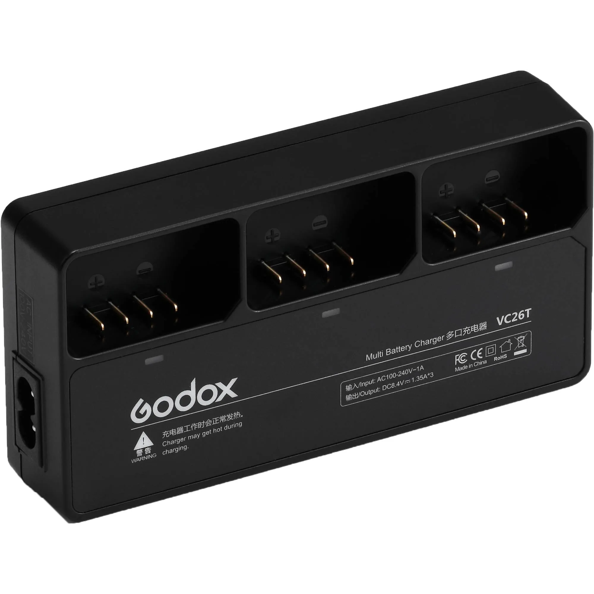 The Godox VC26T is a charger that charges up to three Godox VB26 batteries at the same time from the Godox V1. The charger is connected to the AC power supply, the mains cable is included in the package. Simultaneous charging of three VB26 batteries (for V1) will help make your job easier and faster.