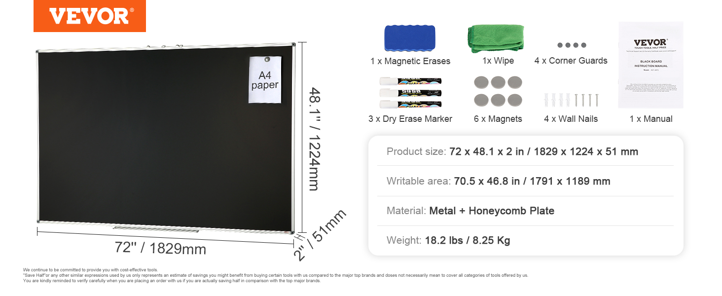 Magnetic Board: VEVOR 48" x 72" chalk boards provide plenty of space for organizing your ideas, teaching lessons, or managing your work presentations. Perfect for collaboration in group work, from classrooms to offices to homes.