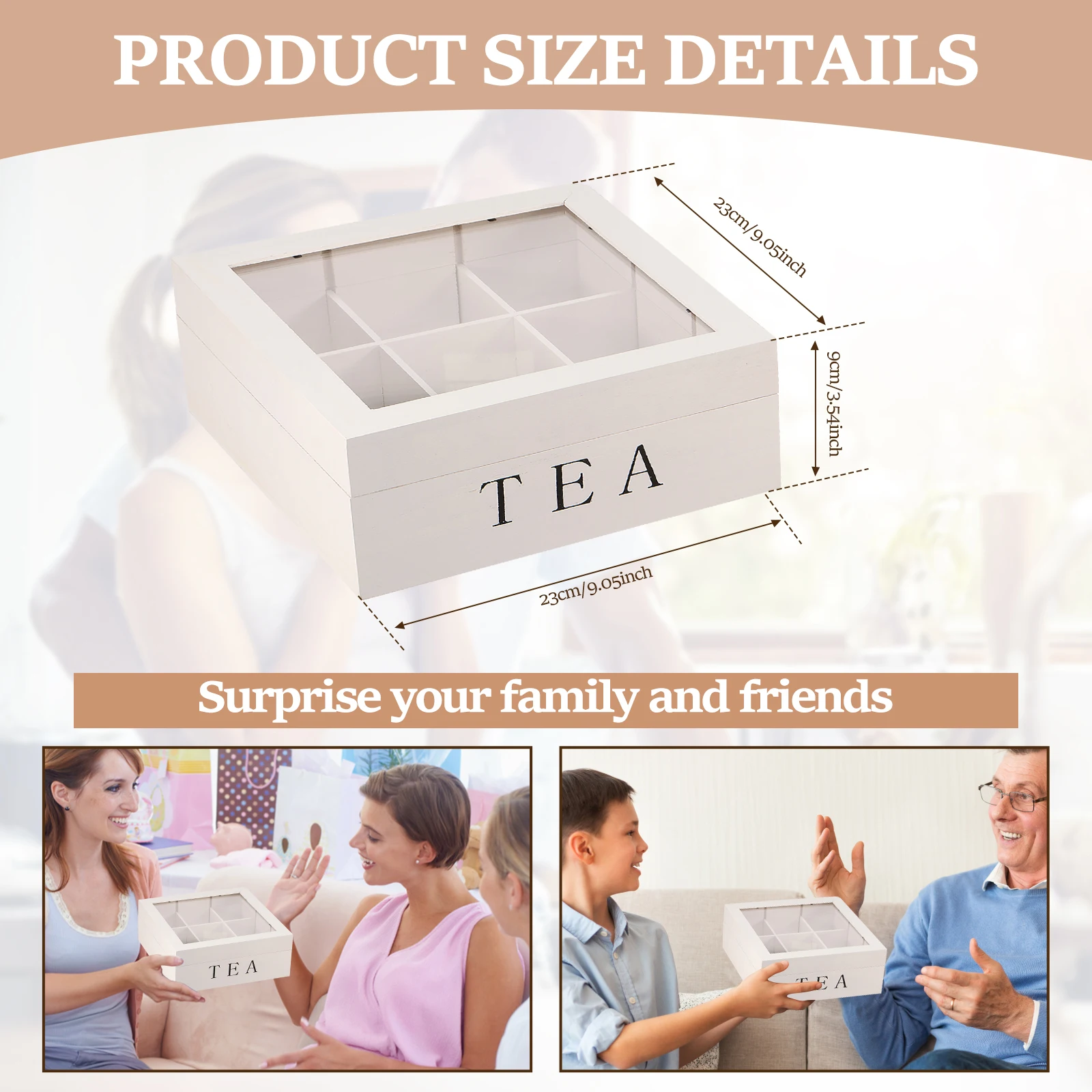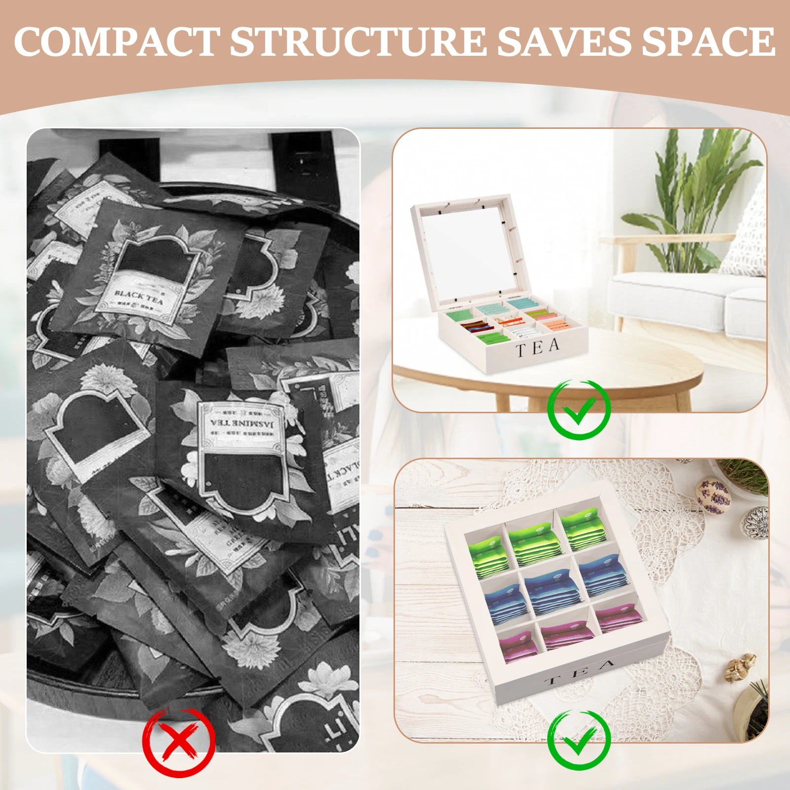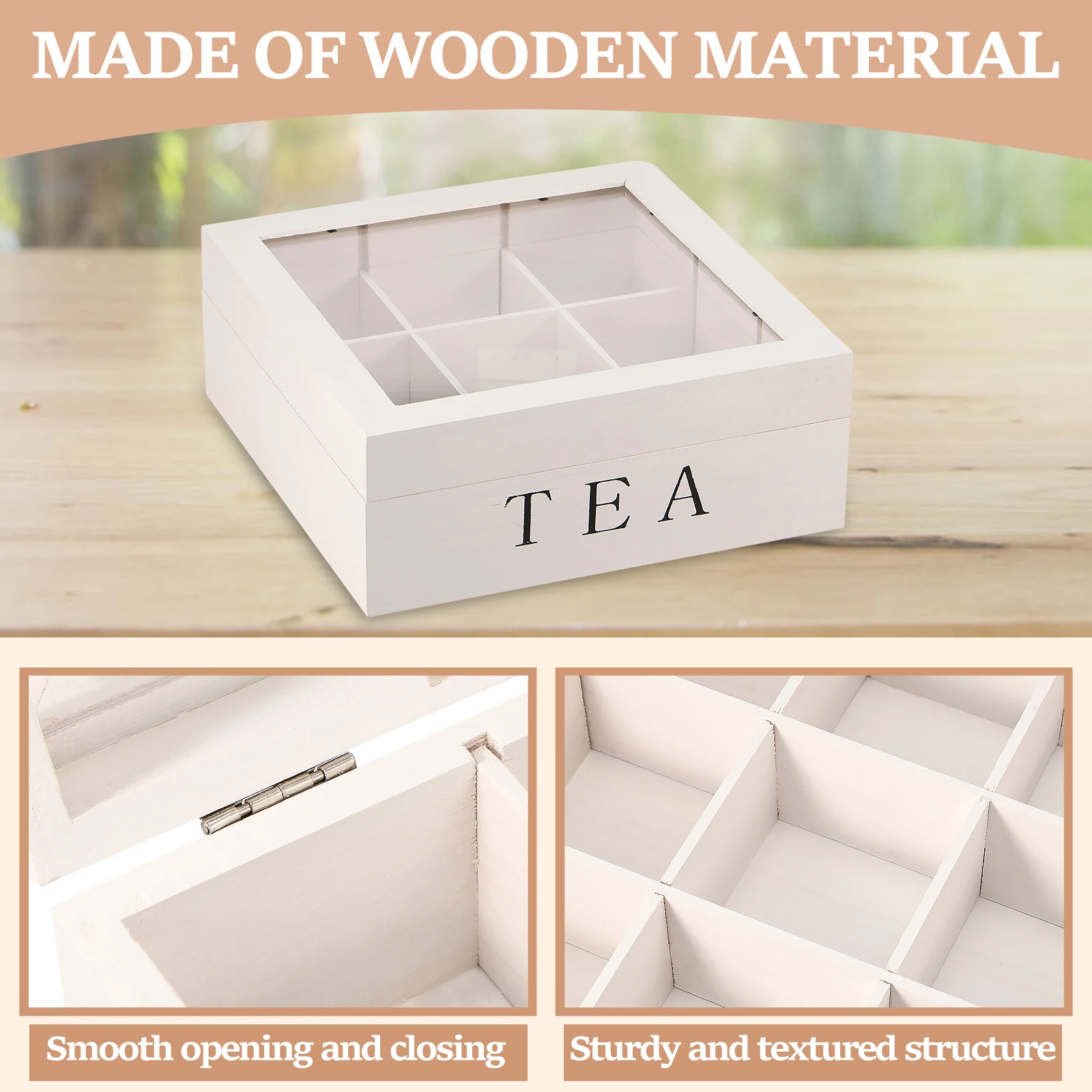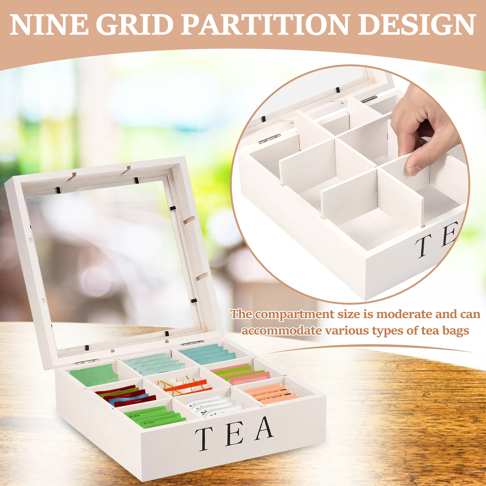 Wood Tea Bag Storage Box with Clear Lid 9 Compartments Square Container Desktop